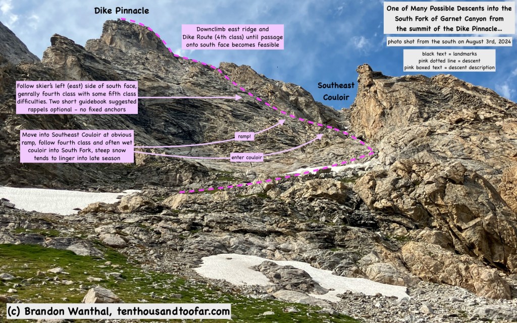 On August 3rd I trotted into Garnet Canyon and soloed the should-be-classic Dike Route on the Dike Pinnacle. While the climbing itself was excellent, the direct descent into Garnet Canyon from the summit of the Dike Pinnacle nearly killed me… metaphorically… of course.