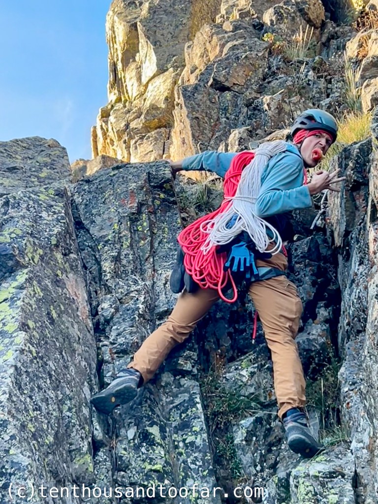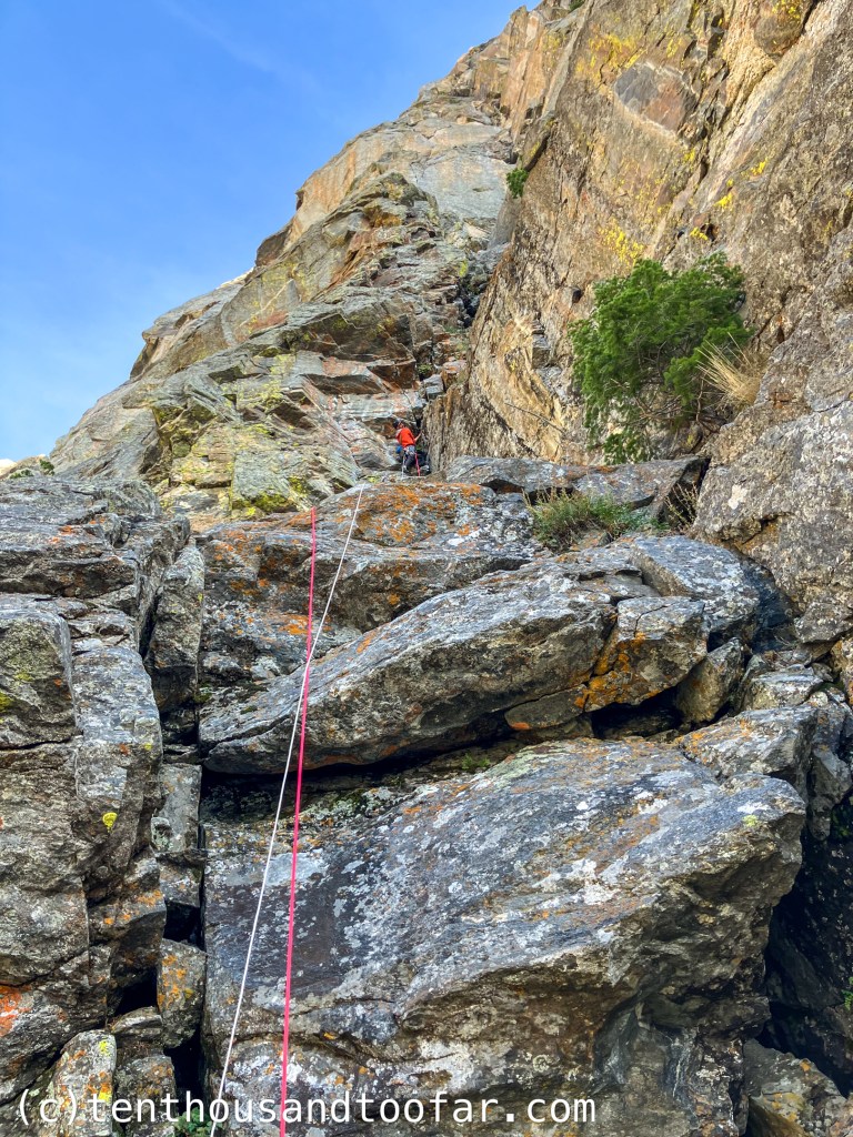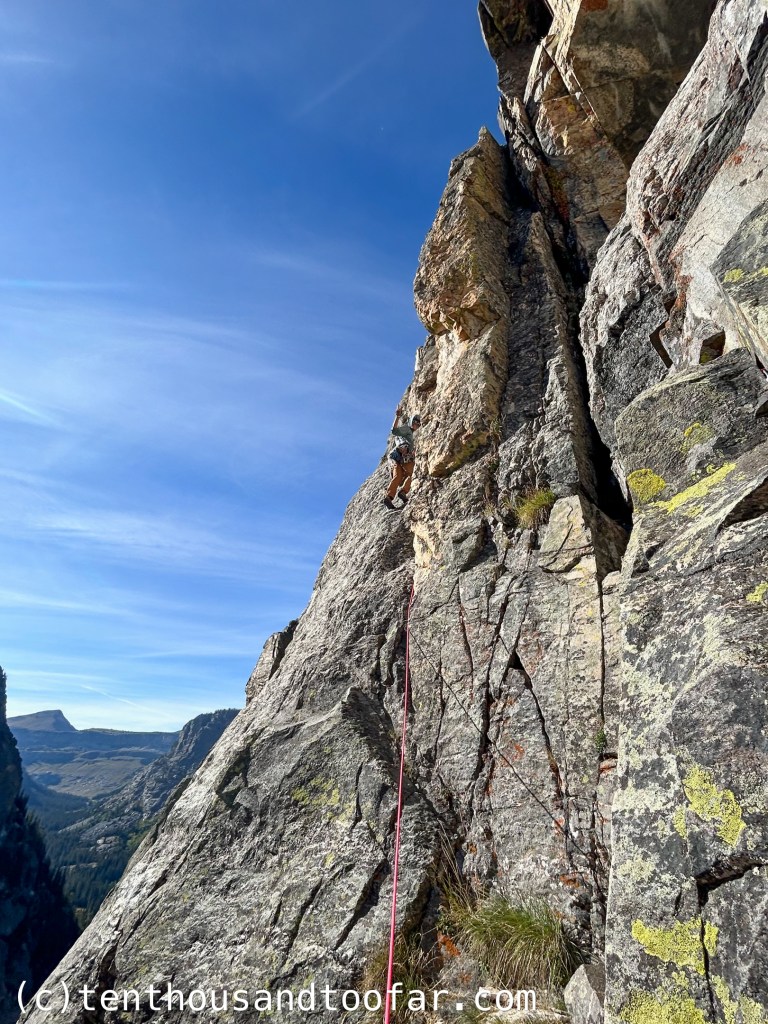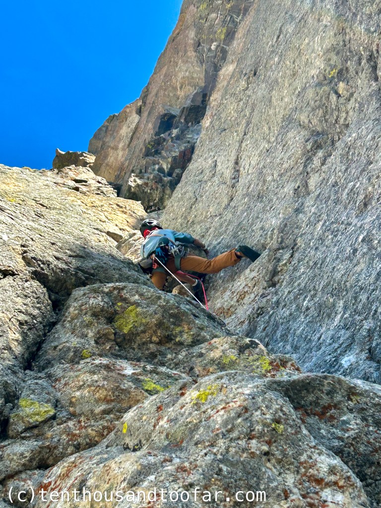 The Snaz is a climb I keep coming back to for its sustained climbing that addresses my weaknesses. It seems like the perfect barometer to gauge progress on burlier and somewhat heady trad climbing. While protection is abundant the whole way, fiddling with gear on overhanging hand jams is always a touch cerebral. After swinging leads in 2022 and finding the climb surprisingly manageable, I was astounded how difficult it was to come back and lead every crux pitch back to back to back. When analyzed critically, I believe that difference highlights a need to develop more efficient movement on the sharp end. Coming from a ski mountaineering and ice climbing background I tend to adopt the old-school “leader shall not fall” attitude, and while it’s nice not to make a habit of pitching off in the alpine, on steep and well protected routes like the Snaz it’s often okay to climb with a bit less apprehension. Clambering slowly over roofs and up steep cracks only increases the pump, the terminal disease of endurance climbing. Other errors included forgetting electrolyte tablets on a long south-facing summer rock climb, and neglecting to scale caloric consumption for the increase in physical output – I reached the summit nine hours after tying in with a suspicious amount of food. With those three points covered, I still feel a tremendous sense of accomplishment in being able to safely and somewhat steadily lead all the pitches on a Teton test-piece at the 5.10- grade – a tremendous indicator of growth from this young climber who often prefers to lambast himself for what he can’t do rather than celebrate incremental progress. I look forward to climbing more with Chirs. Onwards and upwards.