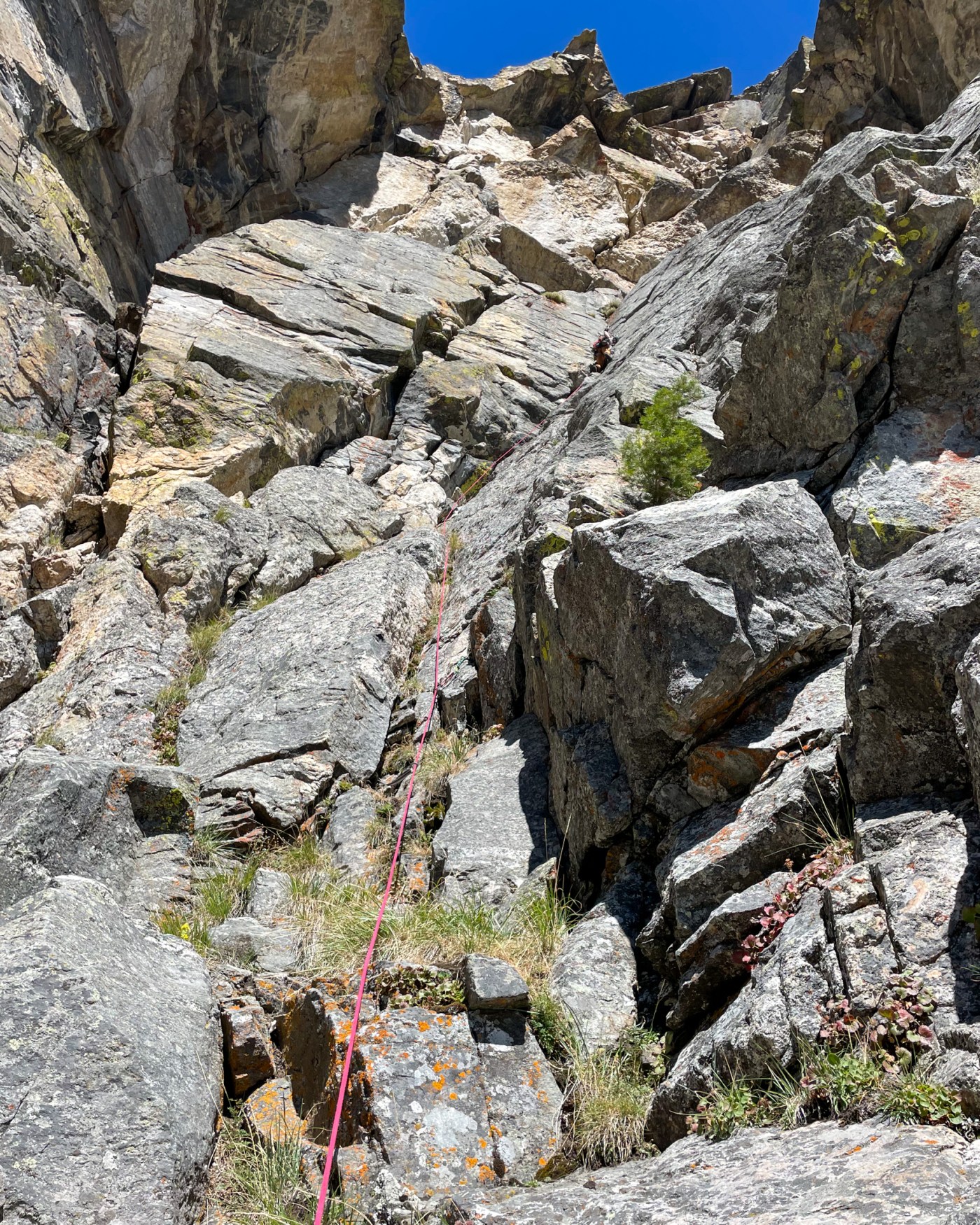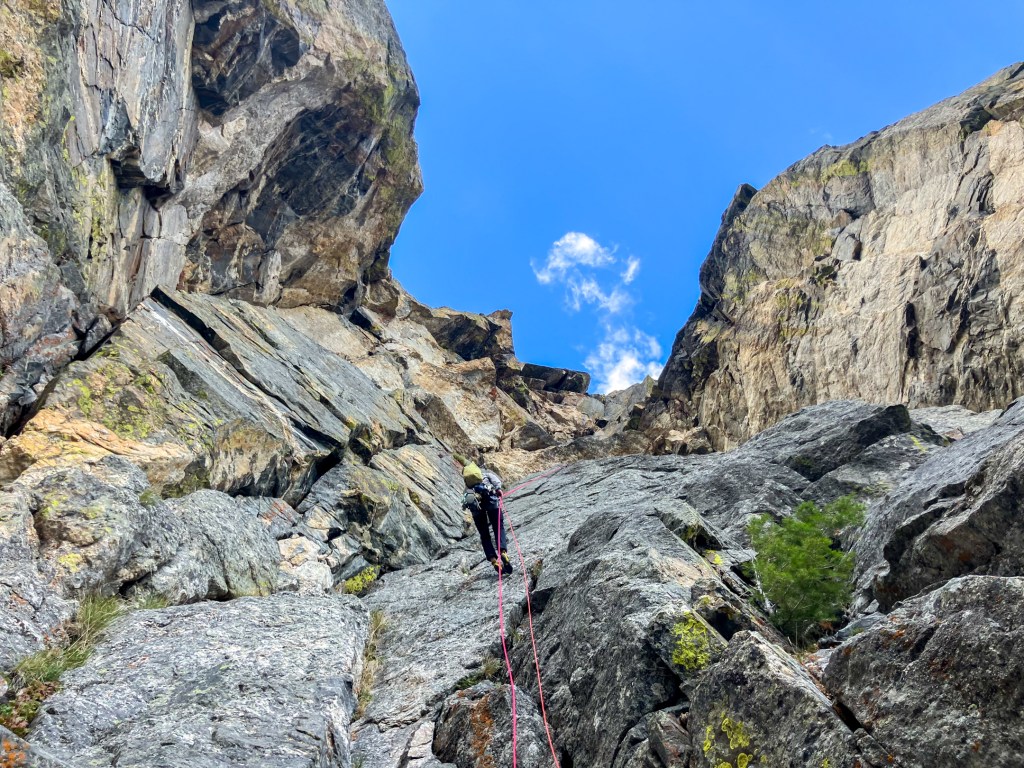 The following pitch, the second to last of the climb and final of 5.9 difficulty, was a 30 foot protectionless slab traverse. The topo noted this obstacle clear as day, stated “runout 5.9”, yet often I find old-school friction cruxes easier than the stated grade due to developments in modern climbing shoes. While this slab certainly seemed to register in the 5.9 realm, friable rock and uninspiring protection to safeguard our sacred hanging belay was disconcerting. Greg offered the lead to me. I climbed up to some shattered white rock in another imposing roof, quasi-equalized two thin wires and a shallow black totem, and down-climbed to an optimal stance to evaluate the traverse. Magical edges oscillated between periods of blankness, and a gentle convexity prevented scouting of any holds further than 15 feet away. The goal was to reach an obvious wedged flake a spitball away, but should I fall en’ route I’d be risking a severe pendulum if my uninspiring gear held, and a significant factor-two onto the belay with potential for raining some small blocks onto Greg if the gear failed, which seemed about coin toss probability. I paddled back and forth onto the first few moves of the slab, brushing lichen off crux footholds and retreating whenever I wasn’t 100% certain. Eventually I identified an in-cut crimp a few moves along I could use for a rest, yet the instant my fingers latched over the edge the scaly white rock sheered away. I watched the best hold on the R rated crux pitch careen into the abyss and barely arrested a fall on body tension alone. I looked back to Greg and his face told 1000 words. 50 feet from the summit of Vas Defrens we were headed down.