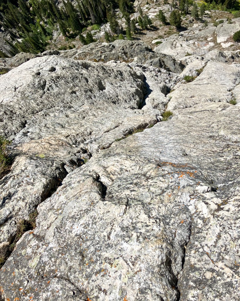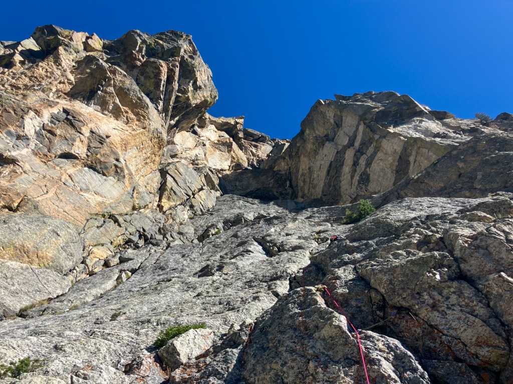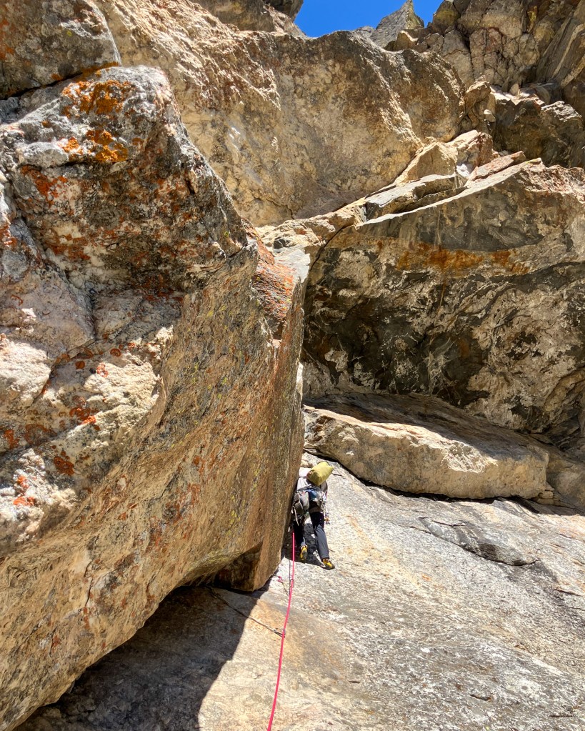 Aside from the first ascent party, atypical name and daring grade, Vas Defrens packs attraction by ascending the most interesting rock feature I’ve seen in Grand Teton National Park – a massive multi hundred foot wide, and at least 200 feet long, hanging cave-like cirque with overlapping arced roofs known as “The Amphitheater”. Only two routes have entered and exited The Amphitheater, Lot’s Slot (5.10, IV) and Vas Defrens (5.9R, IV). The former tackles a more logical line by way of a wild black chimney on the east side of the roofs, but features a pitch of “5.9 serious” on very loose rock and thereby is not recommended and has likely never seen a repeat. Vas Defrens comes in from the west, joins Lot’s Slot for a few pitches but traverses to the west side of The Amphitheater where three near horizontal pitches surmount a tidal wave of roofs via “5.9” overhangs and unprotected slab traverses. Getting to The Amphitheater is no easy feat in its own, requiring 5-6 pitches and 800 feet of vertical rock up to 5.9 in difficulty. Sprinkle in the loose rock, route finding issues and heady dose of the unknown synonymous with “old-routing” and you have the breeding grounds for a character building adventure.