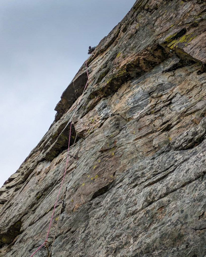 I’ve long heard folks postulating about this extremely logical link-up, yet never known of anyone actually doing it – surprising given how logically the transition between routes flow together. On paper the day finishes with four pitches of 5.9, one pitch of 5.8, three pitches of 5.7 and two pitches of 5.6, with some variation depending on how long or short you run the pitches. In more tangible terms – it’s about 900-1000 feet of technical rockcraft. If considered its own route the Ship’s Prow Triple would land firmly at grade IV. It’s important to note that we only climbed the crux pitches of Annals Of Time and Dihedral Of Horrors, and not the single 5.8 filler pitch which connects the first pitch of Cardiac to the cruxes of the latter. Though the linkup could technically be completed with any random order of the three routes, it seemed most logical to climb Cardiac first for three reasons. First, Cardiac is the easiest of the three routes (only 40 feet of 5.9) and we needed to carry food, water, approach shoes and a tagline to the summit, making our packs relevantly hefty for the first route – best to do the easiest climbing with the heaviest load. Second, The crux pitches of Dihedral and Annals can be reached via rappel from the same anchor, which allows for seamless transitions between routes. Lastly, if trying to avoid climbing in direct sunlight our order makes the most sense, as Cardiac faces east, Annals faces south and the Dihedral faces southwest. The only thing I could imagine doing differently would be to use a fixed single strand rappel rope to access Annals and Dihedral. If using the boulder anchor east of Annals the rope would not drape down any established routes, thereby not effecting other parties on the wall. It would provide the most streamlined transition between climbs and not require the carrying of a tagline up every route, and the rigging and pulling of a rope system before and after each climb. We did not benefit from this strategy because I’m a frugal bastard and use an generic 5mm spool of accessory cord as a tagline – oh well. On a personal level, this day was an extremely satisfying bookend to my objective oriented Grand Teton National Park climbing season, and an awesome day out with a solid new friend. New alpine partners don’t always work out this seamlessly, yet fortunately Lainey is but one of many successful new partnerships of summer 2024 – and in a place as inspiring as the Tetons one can never have too many partners.