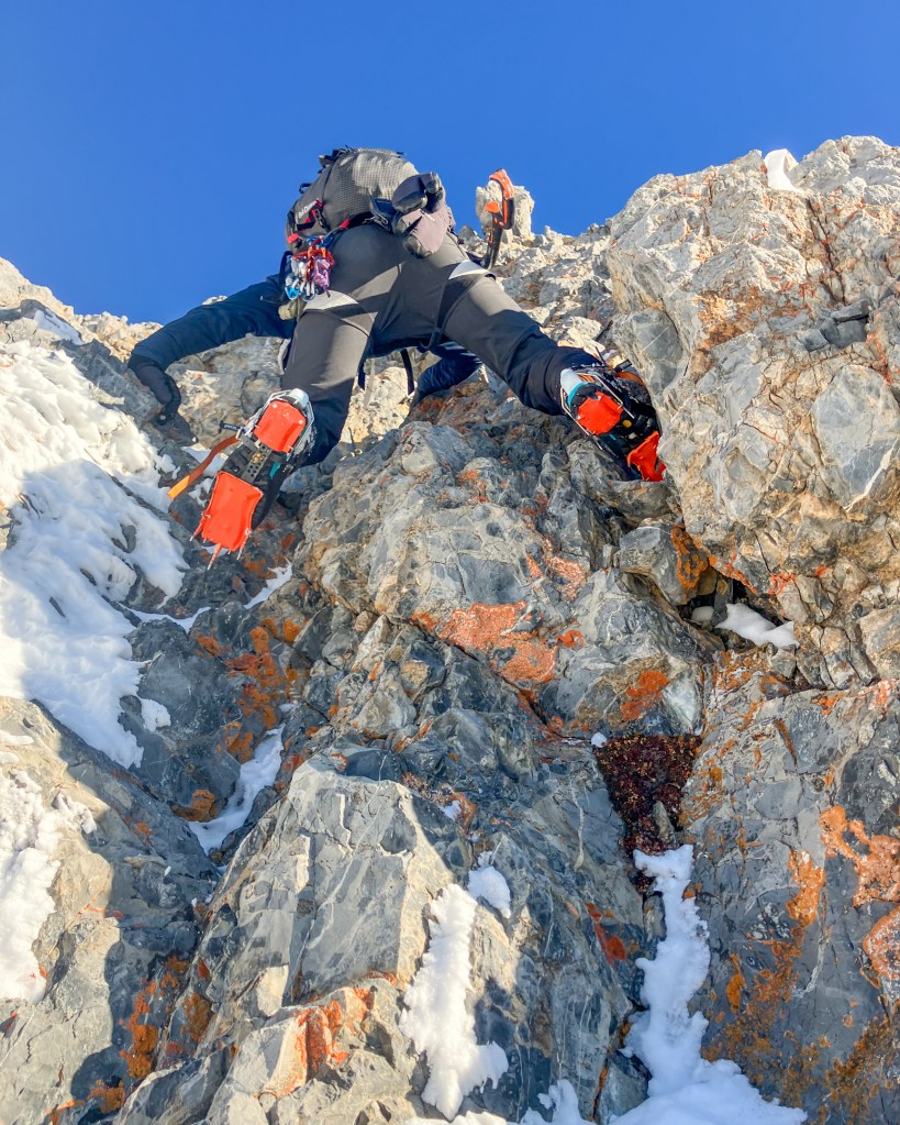 We eagerly rounded the wall of Psycho Therapy hoping to see a spectacle of glinting ice, yet were disappointed to find a 100% bone dry, and unnervingly dark, gash couloir. We deliberated briefly about whether ice may be hidden, or whether the route was climbable when fully dry, but ultimately sided towards caution. December days are short. 11:30AM was veering on recklessly late to start up a grade three, 1000 foot, alpine mixed climb of M6 difficulty, in any but the best conditions. Had there been fat ice we would’ve surely clocked in for the night shift, but today just wasn’t the day. Even though we were long overdue for alpine ice conditions, we resolved to blast up the classic North Face in the name of fitness. The 2,000 foot route was about 50% concrete-hard neve, 30% steep snow, 5% alpine ice and 25% dry rock. We belayed two short pitches approaching the Northwest Ridge. The first was a 60 degree crystal clear AI2 runnel capped by poorly protected 5.4 rock climbing around a chockstone. The second was scary unconsolidated snow climbing over jumbled talus fins. On the Northwest Ridge we packed the cord, expecting 200 feet of fourth class terrain. Instead we found several sections of exposed vertical rockcraft. The difficulties would have been negligible in approach shoes, but at 12,600 feet with rotten snow, icy rock, and crampons, I was engaged. Vinny forged ahead with his trademark bold style. I bonked, made some critical route finding errors, and got stranded in fifth class terrain I couldn’t down-climb, with multi-thousand foot exposure. After composing myself and meticulously negotiating some thin mono-point slab moves I hope never to repeat without a rope, I leaned on Vinny to blaze the way, and trailed his coattails closely. We reached the summit of Mount Borah at 4:00PM.