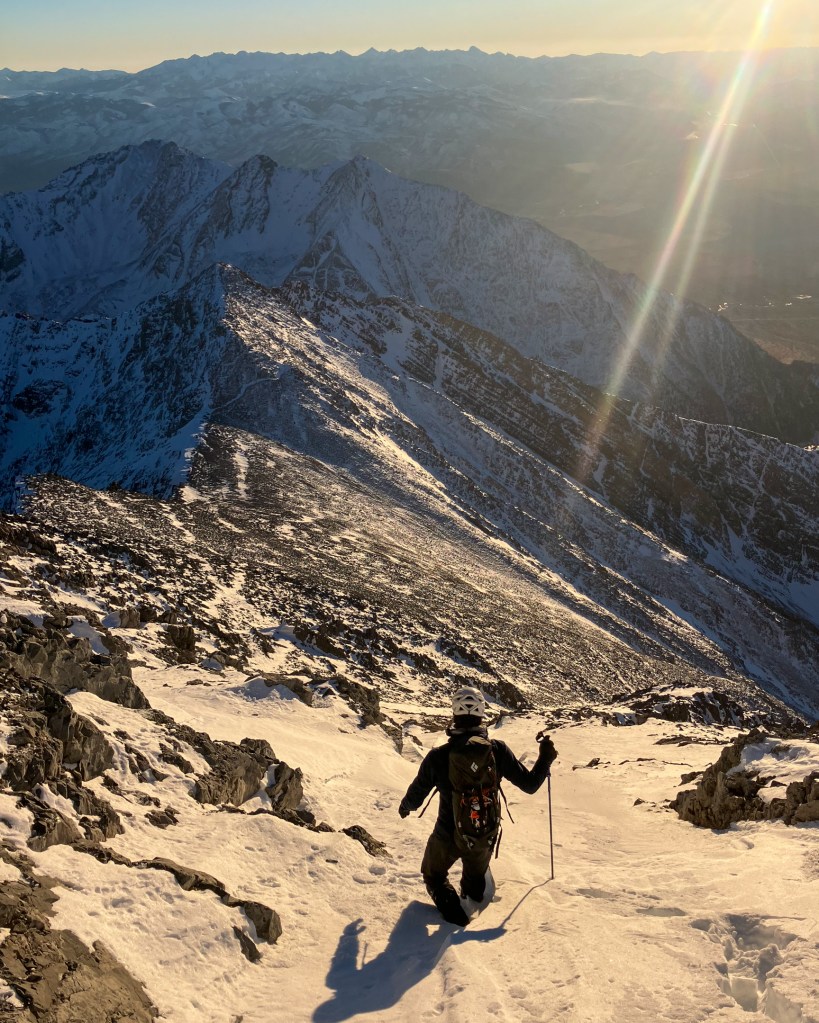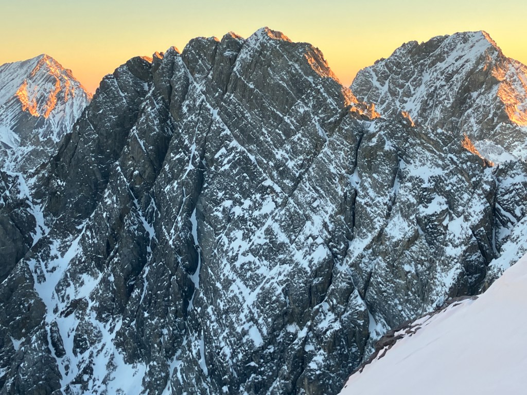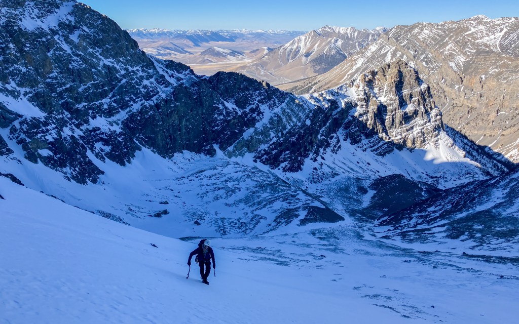 We descended a very snowy Southwest Ridge to the car in about three hours, accompanied by a spectacular sunset. The namesake “Chicken Out” fourth class crux was plastered with thick snow and very exposed – slow business by headlamp and crampons. Although we didn’t succeed in our first objective, nor climb the North Face in prime conditions, this was a 13 hour day of the finest quality. The north face of Borah is a raw, remote, and foreboding place. We didn’t see a single human during our 24 hours spent camping and climbing on Borah. Why there wasn’t a lick of water ice on the entire North Face remains unclear, but other such accounts suggest that could be Lost River Range standard. Enigmatic is the word. We’ll be back.