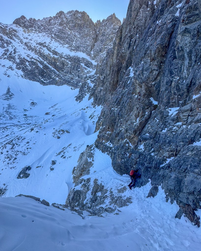 We approached the north face via the Mike Howard Traverse, using a hand drawn map from Dean. We left the Southwest Ridge at 8,600 feet and traversed laterally north, across the west face, for 1.75 miles of rugged bushwhacking through unforgiving high desert forest, crumbly rock and ball bearing faceted snow. An unsuspecting rappel, and high stakes down-climbing on snow covered fourth class slabs, delayed progress. From a saddle at 10,600 feet on the Northwest Ridge we passed a lone Big Horn Sheep and began our descent to Borah Glacier following a steep, loose and vague ramp system. Having heard horror stories from this supposedly low-fifth class, cryptic and extremely loose traverse we expected a severe twist around every bend, but fortunately passage was straightforward. That said, we benefited greatly from a tactile surface of wind blasted snow. Weak snow or dry conditions could raise the stakes. The ledge system gets less than body width in many places, the rock is underfoot and for handholds will crumble with so little as a sneeze, and the exposure is dire. We reached the Borah Glacier about five hours after departure.