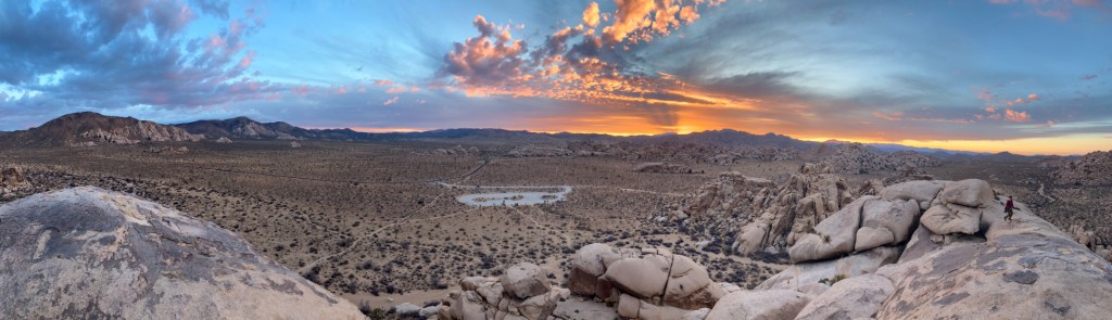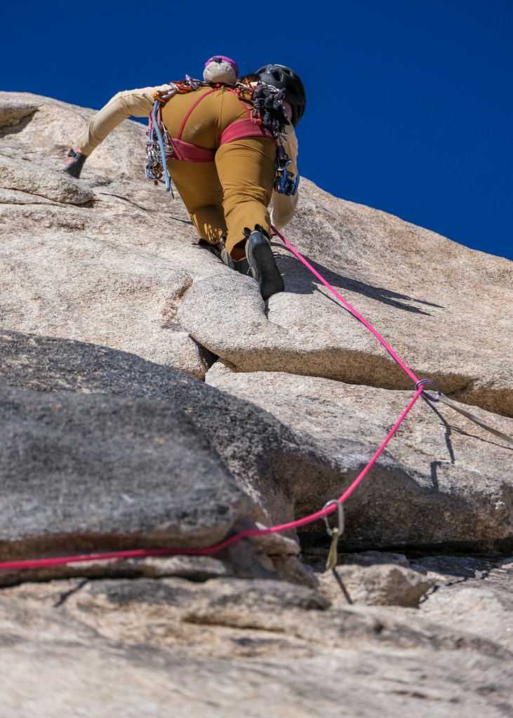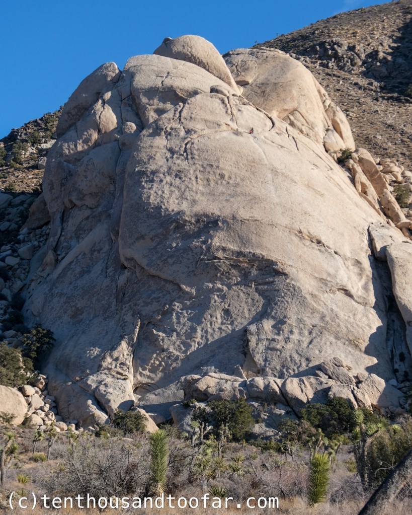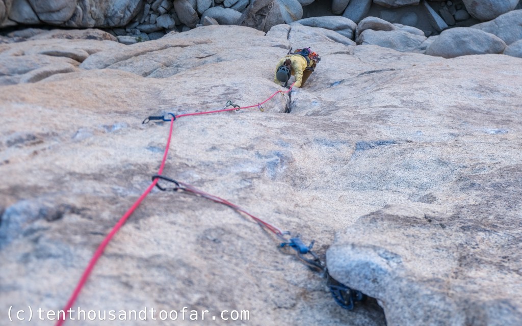 When Bobbi Clemmer and I arrived in Joshua Tree last winter, we spent the better part of our trip deciphering the nuance of the rock, and learning basic crack technique. This year we were initiated, armed with enhanced technique, formal goals, and a handful of aspirational routes. We spent our first few days getting acclimated around the Hidden Valley Campground, climbing some lesser known routes that caught our eye in 2024: Spaghetti and Chili (5.8-), West Face Overhang (5.7+) on Chimney Rock, Sexy Grandma (5.9), Mama Woolsey (5.10a R) and Dandelion (5.10a), as well as repeats of Toe Jam (5.7), Double Cross (5.7+) and Buissonier (5.7). Of those, Buissonier and Mama Woolsey were the most significant. The former represented the hardest traditional lead of Bobbi’s life, and her first proper whipper on gear. While only “5.7” in the guidebook, Buissonier would be 5.9 in just about any other venue, with awkward crack climbing requiring equal measures of balance and raw power, following a massive arcing flake pinned against a featureless vertical slab. While Bobbi has been leading on trad gear for many years, she has always preferred to stay within her comfort zone, never risking a fall. Taking the “first whip” is a right of passage for the budding trad warrior. Furthermore, she placed her gear well, fell safely, and had the composure to finish the lead clean. Mama Woolsey was my first 5.10a trad lead in Joshua Tree. While I’ve been steadily leading 5.10 trad across the country for years, and even led my first two 5.11 Teton cracks this summer, Joshua Tree 5.10 is a different game. In ironic style, Mama Woolsey even had an “R” rating, with the crux being an insecure fingertip layback protected by a lone and dubious #1 TCU in an old piton scar. Routes like these have always been my style – technical off-vertical faire demanding composure, acceptance, and commitment – rather than steep faces and sustained cracks. Scanning the guidebook that evening, I identified a few 5.10’s that would test my weaknesses, and slept dreaming of steep hand jams.