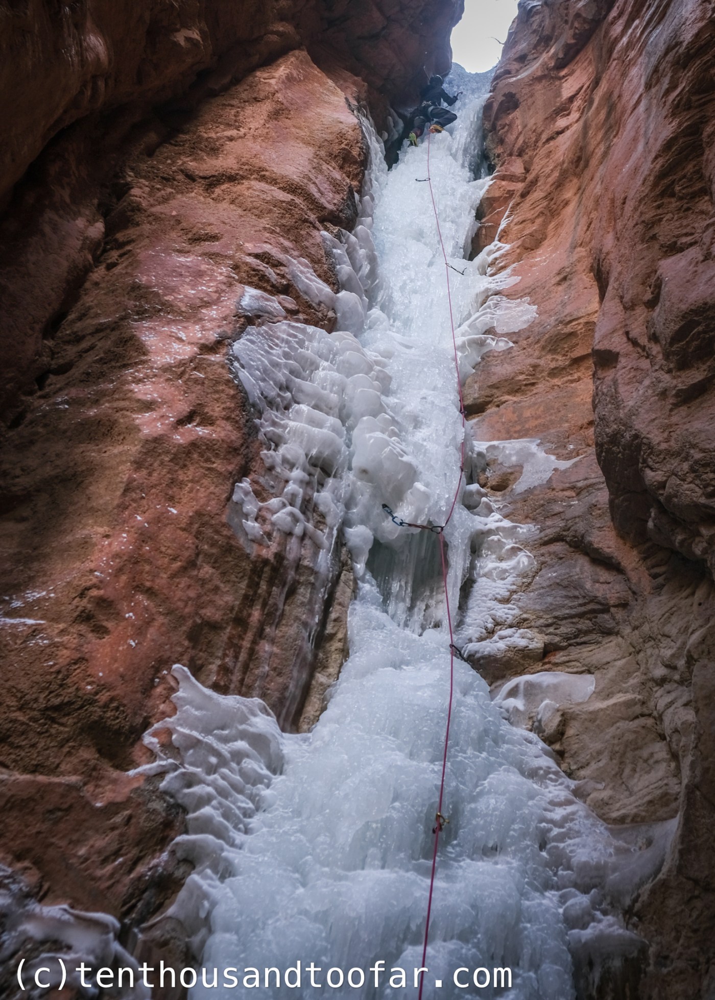 All four pitches have their magic, but the premier pitches are the first and fourth. Pitch one is the perfect warm-up, a sustained and straightforward 50 foot wall of WI3. Pitches two and three are shorties, WI2 and WI2+ respectively, twisting through tight pinches in a progressively narrowing slot. On pitch three I used palm presses on the smoothest of smooth orange sandstone to work through a particularly thin step – reverse canyoneering. The final pitch is the ultimate prize, a steep and narrow 100 foot ice vein exiting an bottle-like cave feature, providing an echo for every swing. While this pitch has been officially stamped WI4, I’m hard pressed to imagine WI4 caliber ice ever forms given the less than vertical steepness of the chute beneath. Our conditions provided two distinct difficulties: a strange mini-roof feature halfway up with a few moves of technical stemming off the glazed wall on climber’s right, and severe candling like I’ve never seen before, requiring tenuous clearing for secure tool placements. Oh… and just like all candled pitches, protection was dubious at best. Snapping a crampon toe-bail on lead was a third difficulty, but fortunately I was in a good enough stance to place and dangle from a screw, and tag one of Bobbi’s crampons up. Lesson learned: replace crampon toe bails annually. This one was three years old and showing early signs of rust – user error.