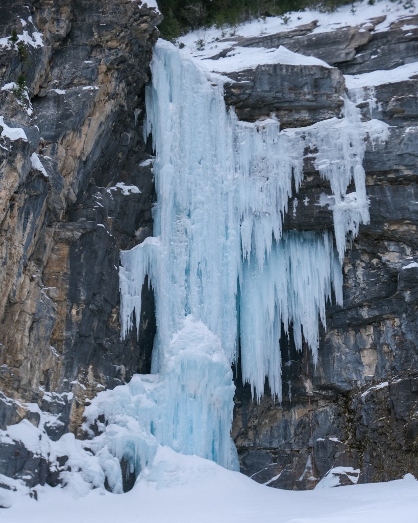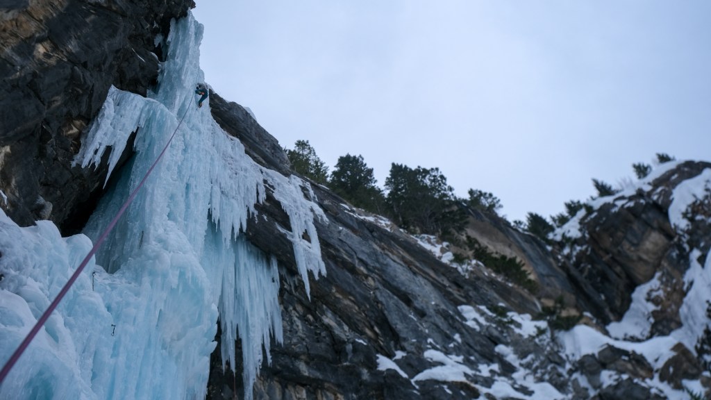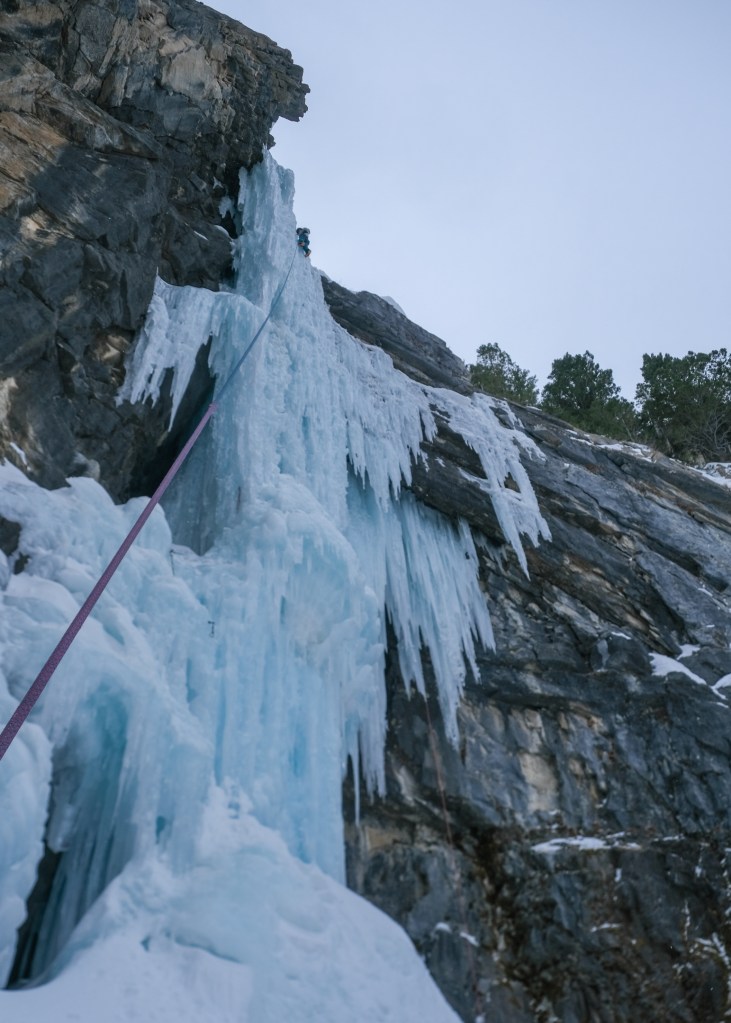 My first two 2025 Eagle Scout visits were only three days apart, following the coldest weather snap of the winter. In the days preceding my climb, temps dipped as low as -30 degrees Fahrenheit for several days. Before the cold snap, it had been quite warm and sunny. This severe melt-freeze swing nearly refilled the route, covering most signs of prior traffic. Though the Eagle Scout will never be as “hooked out” and “stepped out” as classics in Hyalite Canyon or Ouray, it does see a fair bit of early winter traffic and thus, like any steep pillar, becomes easier with every ascent. On February 6th, the ice was nearly pristine, and therefor, I found the work quite difficult. Compared to 2023, the physical formation of the ice was more technically challenging. 30 feet of easy but funky WI3+ climbing, with a bizarre step around a vertical arete, led to a no hands rest on a snow mushroom that forms in some capacity every year. From the mushroom, 40 feet of vertical WI5 climbing in a stem groove led to an ice roof, forcing a technical overhanging traverse right onto the steeper side of the pillar, and finished with another feet 40 of dead vertical climbing, sans groove. In 2023, the groove continued to the top entirely on the left side of the pillar, earning the consensus grade of WI5-. In 2025, between the overhanging traverse and steeper finish, the Eagle Scout landed closer to WI5+. Having not climbed steep ice in over one month, I struggled through a brutal and terrifying onsight, hanging twice on screws to dispel the second worst flash pump of my season. By the time I hangdogged my way to the anchor, I was dejected. After my partner followed, I pulled the rope and led the route a second time. Even with a mere two ascents, the Eagle had become easier, and I succeeded in redpointing, though was still despairingly pumped.