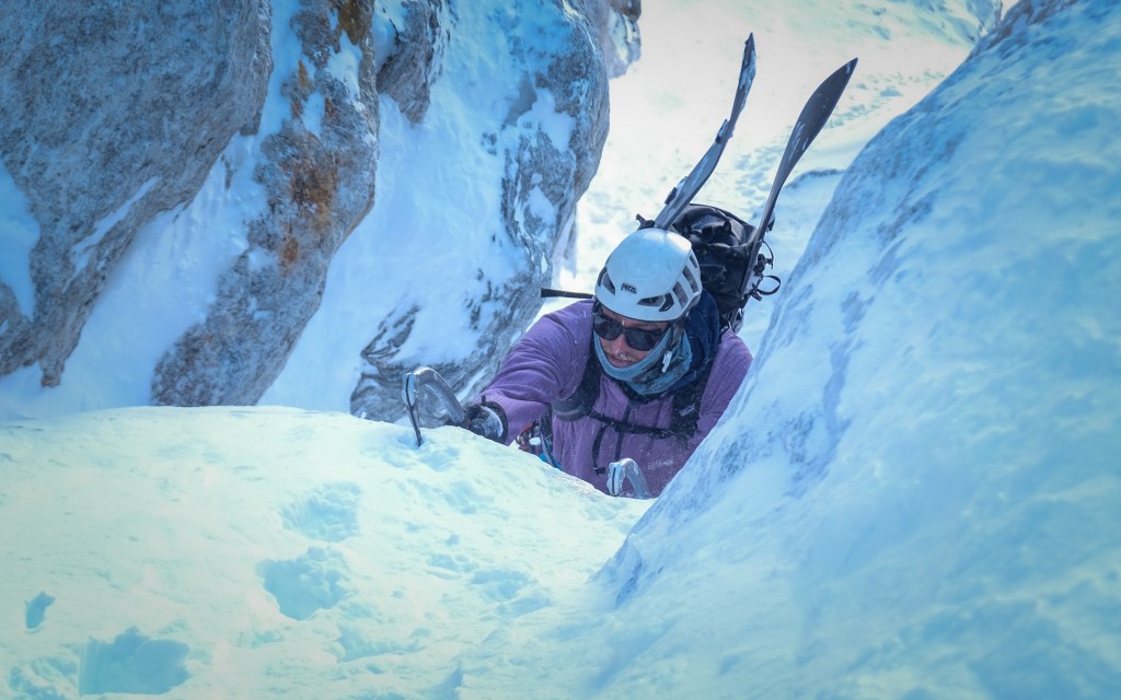 Julian moving through the steepest ice bulge in the Stettner Couloir