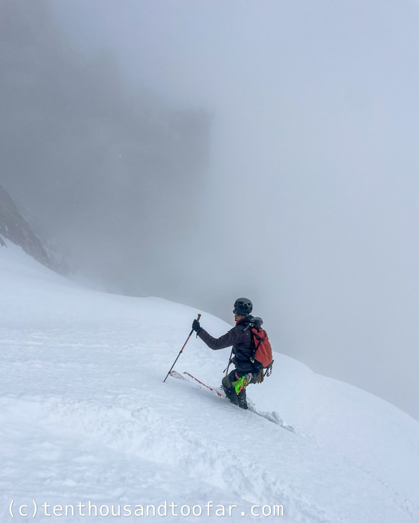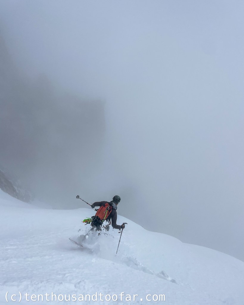 We lingered on the summit for 90 minutes discussing the viability of the Otterbody given the breakable crust of the last 2,500 feet, and bands of thick clouds which intermittently dropped visibility to near-zero. With minimal overnight snow and no warming, avalanches weren’t a primary concern. Instead, our conversations were consumed with fears of navigating both difficult snow conditions and visibility on one of the most exposed faces of our lives. Skiing the Otterbody in breakable crust, or a true whiteout, wasn’t an option. Despite what appeared to be a certain retreat down the nearby Ford Couloir, we racked for the main event and skied to a perch on the Southeast Ridge to assess the face. At 12:30 the clouds broke just enough to expose the first band of cliffs 300 feet below, and with a gang of butterflies percolating through my chest, I departed onto the face. My first turns were cautious hand-checks, anticipating the sickening feeling of plunging skis into breakable crust, but the plunge never came. The crust was somehow… someway… supportable. I gradually eased tension and began linking turns through perfect scratchy March powder, dropping further and further into the void, growing increasingly comfortable with every flick of the hips. Hayden and Julian were genuinely surprised when I reported favorable conditions and called them down.