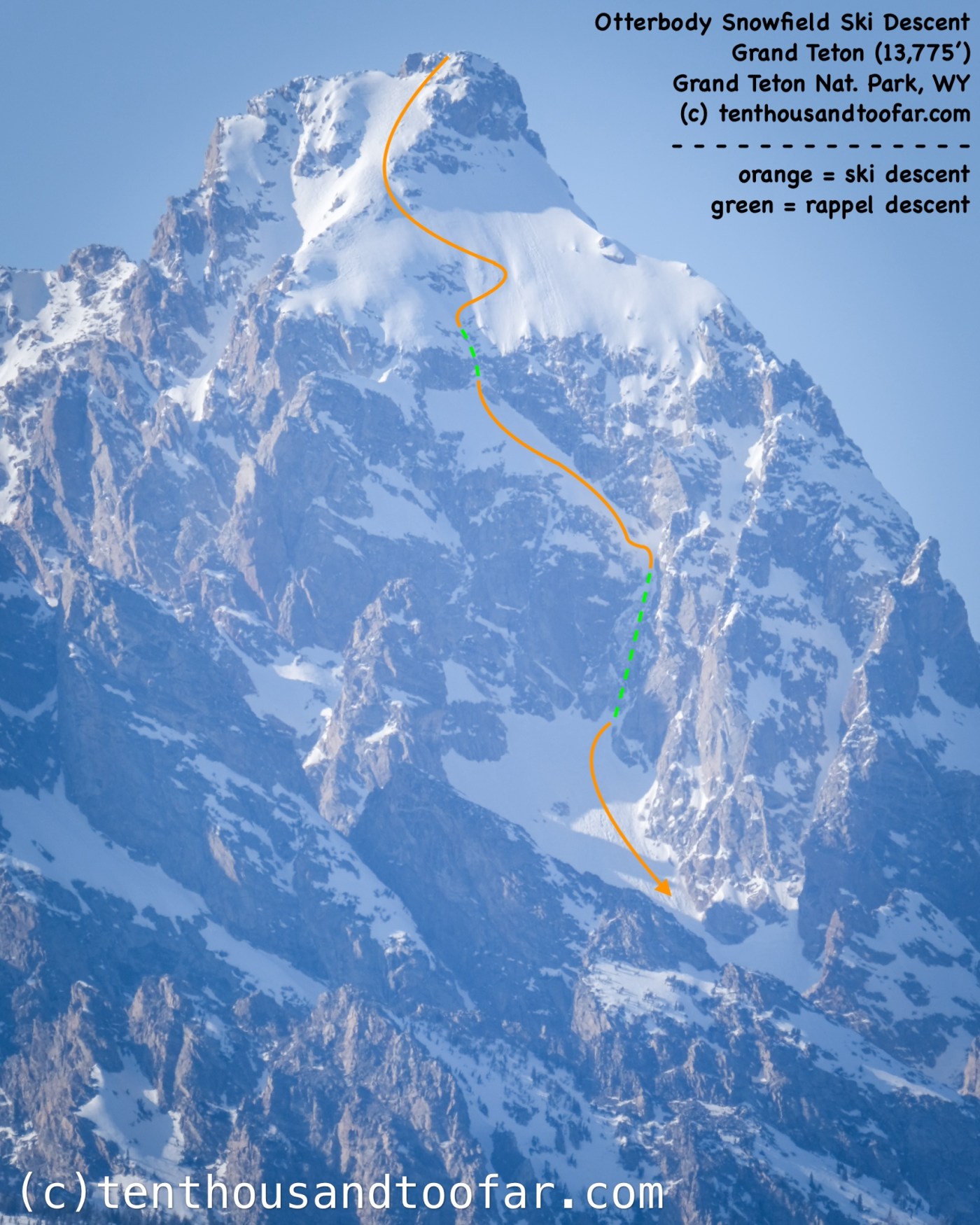 Otterbody Snowfield ski descent topo, as skied by our team on March 30th, 2025. Other parties have skied the left side of the East Face to the first rappel.