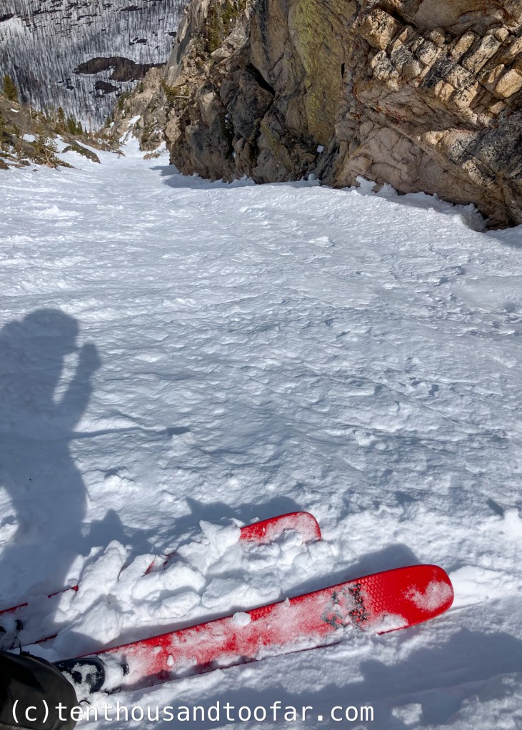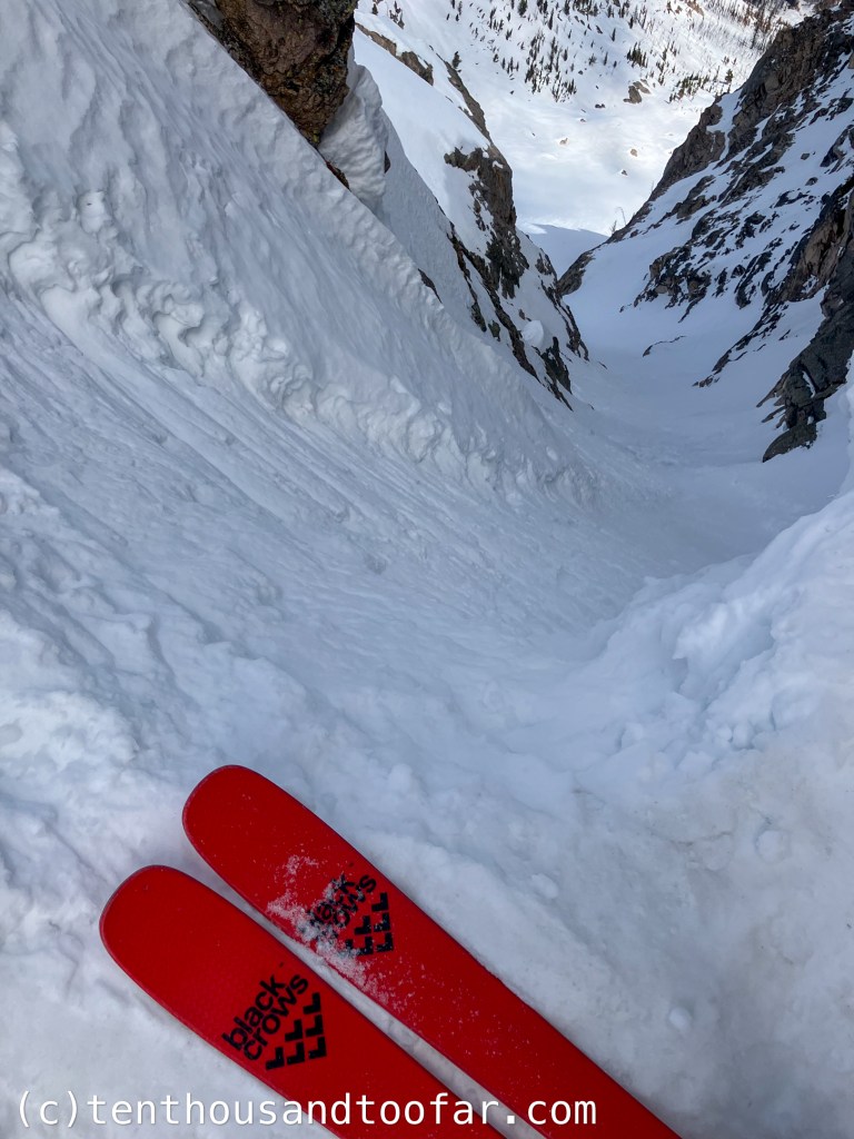The steepness of the last 100 feet of the North Couloir caught me off guard. Looking at photos and videos of years past, it seems this year the top had uncommonly good coverage, plenty wide enough for skis-on passage without clipping rocks. However, I think this coverage also made the slope angle steeper, as I measured an unexpected ~57 degrees leading up to the notorious vertical cornice denounced as “often the crux” by Sawtooth Mountain Guides. Before clicking into skis I systematically disembodied this cornice, sending large blocks of snow cartwheeling to the apron at alarming speed. Clicking into skis and slipping into the line it was apparent that despite leaving the towering Tetons for a range over 3,000 feet shorter, I was currently entering the real deal. Every prior skier had side-slipped the first 100 feet, branding an icy trench into the tight upper couloir. I can’t say I blame them, for a fall here would produce a painful fate similar to my chopped cornice, but if I’m being honest: I was slightly agitated. I was keen to make turns from inception, but because of this concave side-slip track, skiing would be impossible for any ability. I am left pondering whether it’s ethical to side-slip the top of a tight couloir when a skier knows they won’t be able to make a turn, sloughing off new snow and ruining the possibility of turns for others, instead of downclimbing to a place where turns are possible for their ability? I understand not taking skis off mid run, but when the crux is at the top of a descent, I think skiers should consider the impact of side-slipping versus downclimbing on future skiers. Semantics aside, after about 20 feet I was able to escape the track and shuffle left onto an even steeper yet untouched and well bonded patch of soft snow. Committing to the first jump turn was terrifying. I can count on one hand the number of times I’ve linked 55 degree jump turns. It feels more like controlled falling than skiing, with the consequences of a tumble viscerally understood. But when conditions are right, as were today and any other time I’ve released my edges in 55 degree terrain, the feeling is magical, weightless, like flying – each turn transporting me several body lengths down the slope. After 80 feet the angle relented to into the high 40 degree range, and with it all tension. The walls of the couloir held supportable, supple and milky snow perfect for fluent and fast jump turns, the best steeps of my season. The feeling I had at the bottom of the North Couloir cemented the route’s classic stamp.