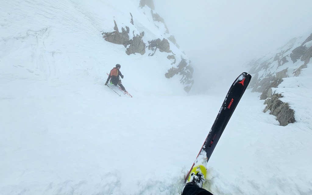Our first turns off the summit were ominous, taking us ever closer to a foreboding rollover marking the entrance of the couloir. For such a prominent, accessible, and road-visible line, the Southeast Couloir sees very few descents. As we crested the rollover and peered into the couloir, I immediately realized why. The upper pitch is remarkably steep, holding a sustained angle in excess of 50 degrees. 500 feet below the summit lays the crux: a rocky ski-width choke often accompanied by a body height ice bulge, entirely obscured by thick clouds today. Difficult breakable crust conditions gradually transitioned to scratchy powder as we jumped deeper into the darkest annals of the South Teton, quickly approaching the ice bulge we couldn’t yet discern. With every turn the vibe became more ominous and unsettling, exactly the opposite of my desire when steep skiing. A pleasant relent in steepness approaching the constriction provided a welcomed reprieve before the slope rolled over again. Right on cue, a fixed anchor came into view. In hindsight, the fact I couldn’t tell whether we’d be able to ski through the crux from six turns above should’ve warranted the deployment of a rope. Instead, soft snow and exciting turns seduced me into those six additional turns. It wasn’t until the fifth I realized the crux was indeed vertical water ice, and the couloir below was too steep and narrow to consider jumping.