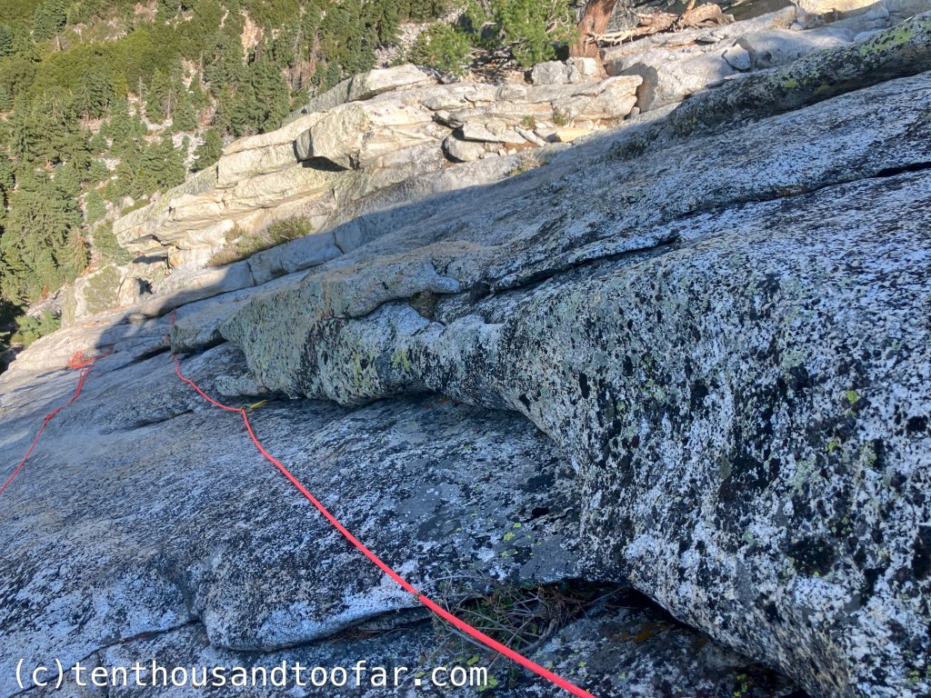 Overall, the day went swimmingly. The 5.9 crux is just off the ground – wild parallel cracks exiting a deep dihedral to a thin slab – but fortunately it both protected and climbed well. I struggled to find the proper route on pitch two. Facing a dealer’s choice of lichen covered runout slabs with no guarantee of protection above, I reluctantly bailed towards El Whampo via an easy ledge system. Those who know me know I don’t surrender easy, but one of the biggest struggles with rope soloing is providing a tight belay. An extra five feet of slack can be the sole difference preventing a nasty ledge fall. If there was any time to back off a runout pitch, this was it. I finished to the top of El Whampo in a peaceful 6.5 hours. Pitch three holds the best 5.7 hand crack I have ever climbed. It’s rare to find a pure 30 meter two-inch splitter, void of any face holds, at such an accessible grade – a true delight. Pitch six was another standout, a brilliant and lengthy 5.7 layback on excellent rock. To make it even better, because I don’t have a belayer, I got to climb every pitch twice! Double the fun, double the pump, and double the classic… what’s not to love. El Whampo is a standout Tahquitz 5.7, and when combined with the first two pitches of El Grandote becomes a must-do classic. I would certainly climb it again.