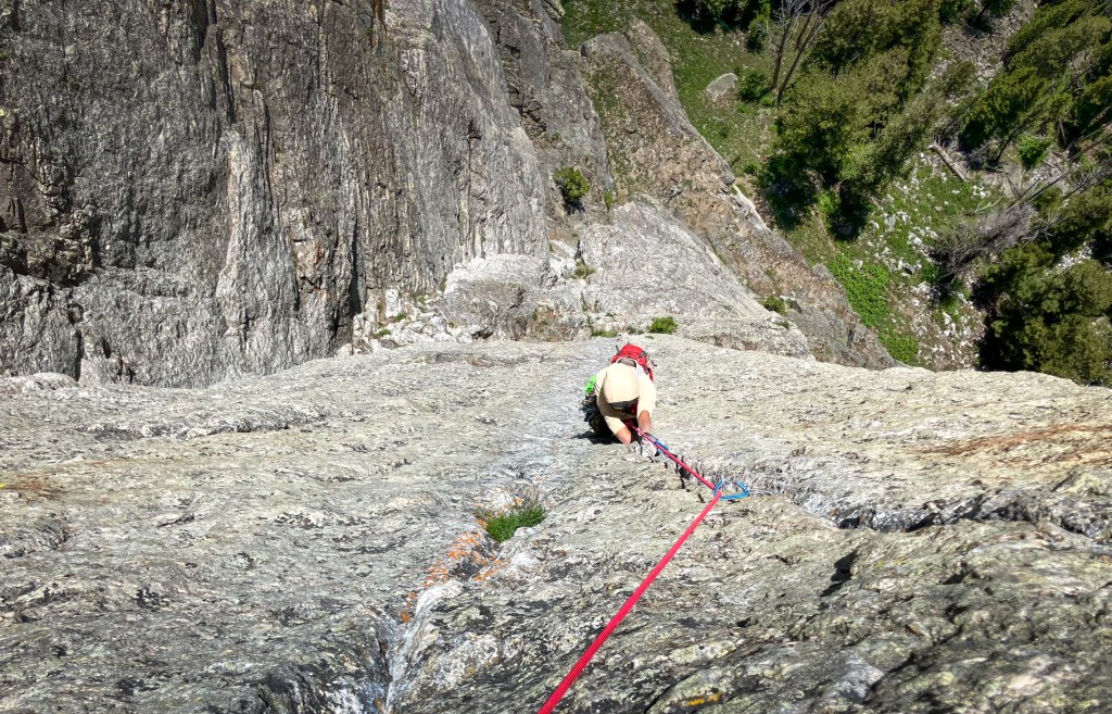 The Snazette has a reputation. The money pitch is about as splitter as Teton crack climbing gets, a striking natural incision cleaving a blank panel of pearly white granite several hundred feet off the deck. If I remember correctly, there’s only one or two jugs on the entire route. Otherwise the work is characterized by relentless thin hand jamming and a bulging crux on rattly ring locks. I personally know several climbers well established at the 5.10 grade that have fallen victim to the sneaky pump-fest that is the Snazette. Mountain Project recommends a triple set of cams from #0.5 to #1. Where are we, Indian Creek?