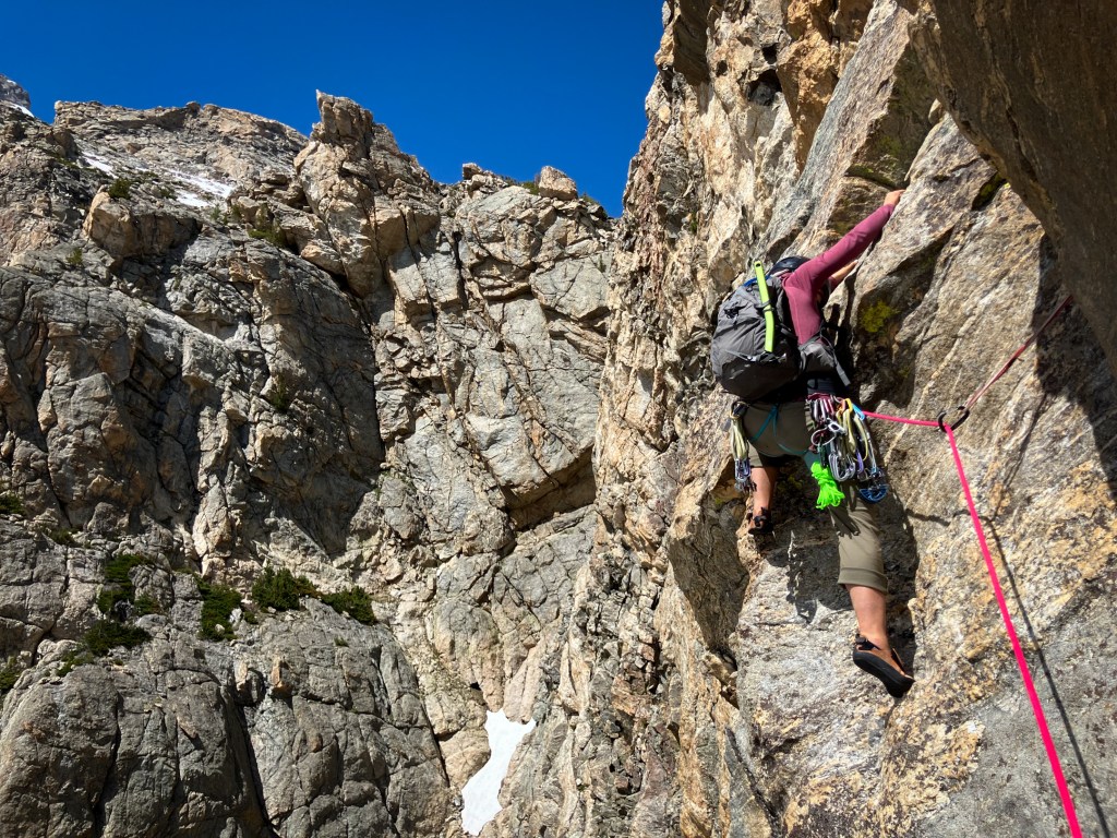 Pitch six offers three variations. The first two begin from a vegetated notch which requires a short down-climb or rappel to reach. In this notch is a large tree. A 5.5 hand traverse begins below this tree, moving right across a short steep section into easy slab terrain on the east side of the ridge. A notoriously unpleasant 5.8 crack, which I’ve never climbed, begins directly behind the tree. Today, Kenzi and I wanted to avoid the down-climb and attempt the direct finish, characterized by 5.10- laybacking over immense exposure at 11,000 feet! Protection was tricky right of the deck, and I struggled to commit to intense granite laybacking over small gear I didn’t fully trust. After climbing into and out of the crux too many times, I eventually forged into serious fall territory, got a sloppy hand jam, and fiddled in another nest of decent-ish gear. Facing a raging early season pump, I attempted to climb the crack head on, frothing for the jug I never found. A short whipper left me hanging on the rope dejected. It’s been a long time since I’ve fallen on 5.10- in the Tetons. I should’ve hauled my pack! While hang-dogging I spotted a sweet camouflaged monster jug 10 feet left of the crack, and worked out a neat foot sequence to snag it. This stellar variation is recommended to those comfortable protecting tricky and pumpy alpine 5.10.