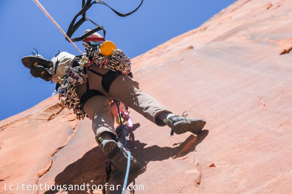 Spaceshot is one of the classic moderate clean aid routes and introductory big walls of North America, following a continuous 900 foot crack system in the heart of Zion National Park.