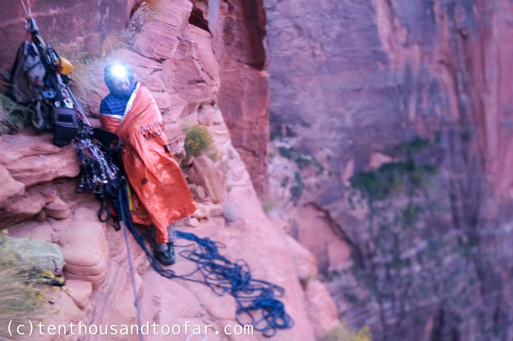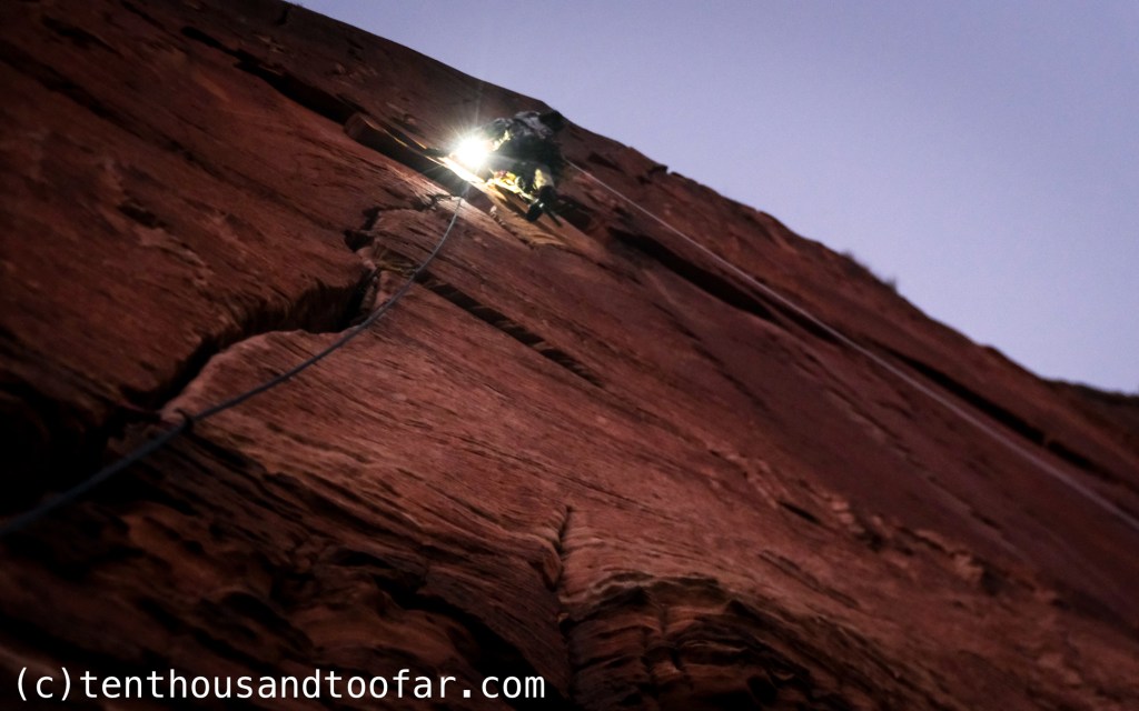 Pitches five and six were refreshingly gentle compared to the tip-toe-tech below. Each was plug and chug C1 with incredible exposure. Back cleaning 20 feet between cams on a bulging hand crack 1,000 feet above the rushing Virgin River and technicolor Zion ecosystem is a feeling unfit for words, unlike any climbing experience I’d had before. Greg finished pitch six in the dark, and I had the ensuing pleasure of jugging a slightly overhanging and traversing hand crack by headlamp. Every piece I cleaned ricocheted me horizontally into space. At first this was utterly terrifying, but quickly I felt like a child on a playground swing. A final steeper and sharper traverse forced a bit of re-aiding before pulling onto Earth Orbit Ledge, our first ledge since stepping into aiders seven hours ago. My heart swelled at the simple prospect of sitting on flat ground. After her own solo canyoneering adventure, Bobbi bussed into the canyon and watched our last two pitches, cheering and photographing us from the road. Hearing your girlfriend yell “I love you!” from 1,000 feet below a hanging belay is special. She’s a gem.
