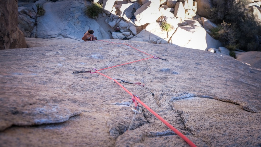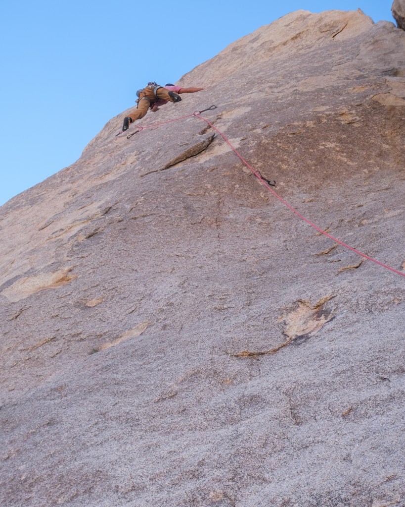 Striving for ethical purity is the rightly gold standard of traditional climbing, and a value I hold dear. However, after a few too many quiet hours of campfire contemplation, I also realized this: fully emulating the style of first ascent will never be possible. Charles Cole had many disadvantages over 2025 Run For Your Life climbers, but also a few advantages. The disadvantages are obvious. He almost certainly had worse climbing shoes, had no pre-identified climbing line or knowledge of the challenges above, and had to tirelessly drill protection bolts by hand. But, he also had advantages. Run For Your Life has seen thousands upon thousands of pairs of climbing shoes. In 1987, those virgin varnished edges bit into shoe rubber like razorblades. Anyone who has climbed the timeless Joshua Tree edging and friction routes such as Heart and Sole (5.10a), Chalk Up Another One (5.10a) and Papa Woolsey (5.10b), then sampled lesser traveled gems such as Penny Lane (5.8), Dial 911 (5.10a) and Pumping Ego (5.10b R) which still boast velcro-esque friction, understand the profound effect 50+ years of residual shoe rubber and finger grease has on climbing grades. Mountain Project comments from Josh veterans confirm this phenomena. Cole also carried a bolt kit, giving him the availability to place protection in accordance with his ability. The first three bolts were undoubtedly drilled from no-hands stances, but the rest stances for the last three are so heinously insecure that I’d bet an entire rack of Totem Cams hooks were used for drilling. Herein lies the great conundrum of all ground up routes: first ascentionists had jurisdiction over the amount of protection they placed, and subsequent parties do not. There are copious edges which would accept a sky hook en’ route to the first bolt. The luxury of having an option to place that bolt, and hooks to hang on, can not be understated. On routes protected fully by traditional gear there’s even more nuance. No modern day climber, myself included, will ever understand the commitment of launching up a virgin crack with a rack of homemade pitons, slung hardware store nuts and a few clunky hexes, with a static hemp rope tied around their waist. Imagine what Yvon Chouinard, Royal Robbins, John Long and John Bachar would’ve been capable of with a svelte selection of ultra-light Camalots, RP’s, Ballnutz and TC pros. I shudder to conceive the possibilities. By this comparison all modern climbers are aid climbing to some unquantifiable extent. Since Royal Robbins led the first 5.9 in North America (pitch one fist/offwidth of Open Book on Tahquitz Rock) using solely homemade wooden wedges for protection, should we all just leave our big cams on the ground, and head to the sawmill before tying in?