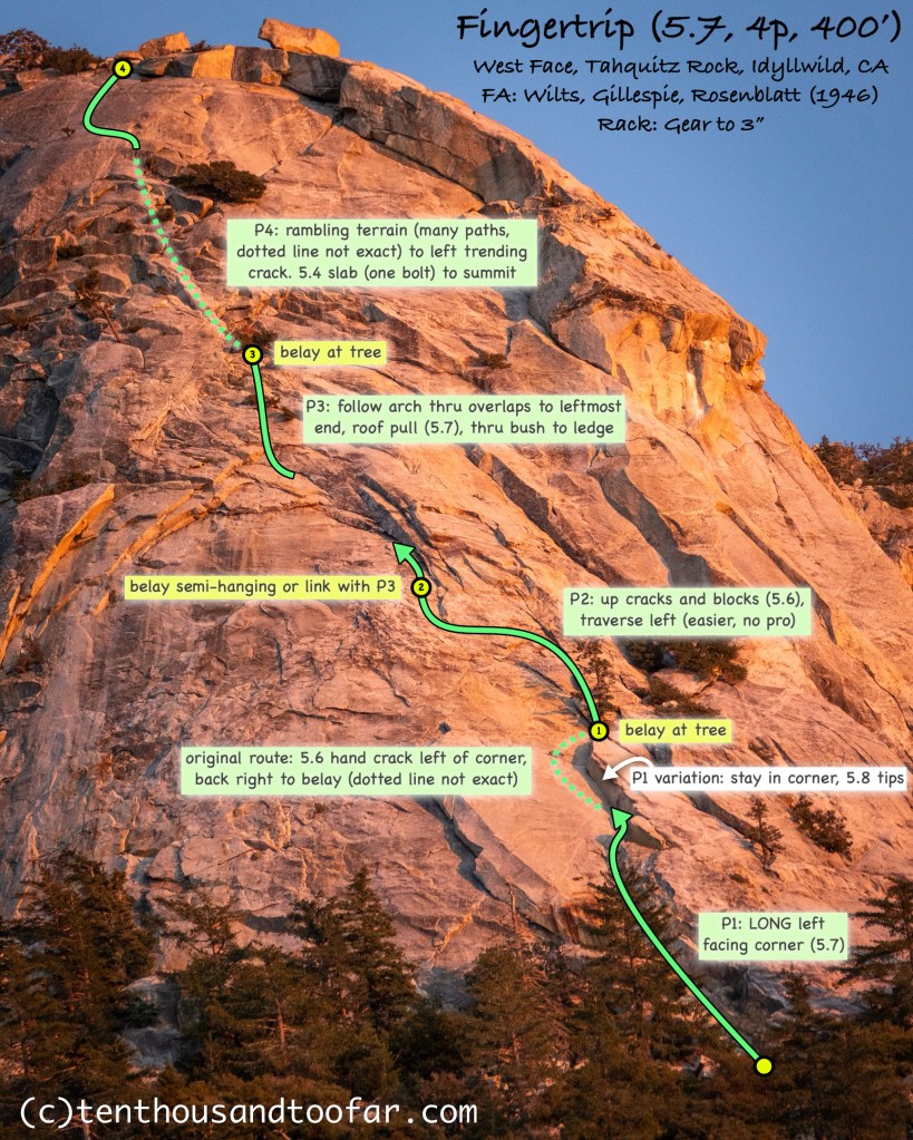 Fingertrip is given four stars on Mountain Project and the highest guidebook praise of three stars. Perhaps sluggishness and numb digits were to blame, but we weren’t quite sure it deserved such marks, especially in one of the epicenters of North American climbing. However, the route really was great. The first pitch is the most sustained, with 40+ meters of 5.7 laybacking through a series of clean polished corners. Towards the top of pitch one, the original route departs the corner for a splitter 5.6 handcrack. A more popular variation stays in the corner via 5.8 tips laybacking. We chose the latter to keep a linear rope line for simul-climbing, and found the difficulties surprisingly soft by Tahquitz standards. Pitches two and three were both interesting and unique, following an “improbable for the grade” system of flakes, cracks and slabs into an imposingly large arch with several overlaps. Reaching the arch involved a memorable, albeit trivial, 20 foot unprotected slab traverse. A sequence of sustained 5.7 laybacking and underclinging across multiple layered crack systems led to the leftmost terminus of the arch and a short punchy mini-roof with excellent exposure. A final pitch of quintessential alpine rambling capped with a one bolt 5.4 slab took us to the top. A “5.4 slab” may seem benign, but this particular one was a completely smooth pane void of handholds, making it anomalous.