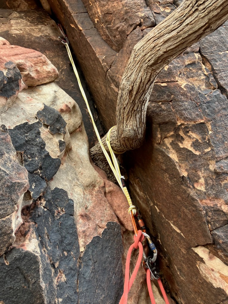 Cat In The Hat may be the most popular route in Red Rocks, owed to a short approach, streamlined rappel descent, and five scenic pitches up to 5.6 on excellent rock. We hoped to find the route empty given our late start on one of the shortest days of the year. Unfortunately, we were wrong. We met two other parties at the base, one inching up pitch one with a bulging rack and a second foursome in cue. Only five hours from sunset, we had no time to wait. We alternated to Cookie Monster, a well reputed 300 foot 5.7 on the east face, which intersects Cat In The Hat on the upper Southeast Buttress. Donning a light single rack and critical motivation to outclimb our fellow parties around the corner, we zoomed up Cookie Monster in a short block of free-soloing and two rope stretching pitches. The route was pure fun, with a dizzying splay of varnished huecos and edges like I’ve never seen before. Typical for Red Rocks, we thought the grade was quite soft. Save for a few thin entry moves into the main corner and a juggy roof pull near the top, Cookie Monster was no harder than jug studded 5.5, and as such I placed about three pieces per pitch. We succeeded in surpassing the Cat In The Hat parties, finding the upper pitches empty. A beautiful varnished corner east of the standard Cat route led to the best moves of the day, a splitter black hand and finger crack high on the ridgecrest, followed by an airy one bolt friction slab. This particular day reminded me of high alpine adventures in the Tetons, where spectacular scenery and fluid motion with a special partner quenches my otherwise insatiable thirst for hard climbing. Within five hours we were cozy in the Tacoma, headed for our first of five nights in the Red Rocks Campground.