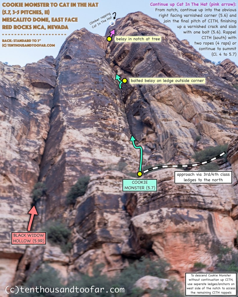Cookie Monster is a high quality 300 foot 5.7 on the East Face of Mescalito Dome that links seamlessly into the final and best two pitches of the Red Rocks easy classic Cat In The Hat (5.6, II).