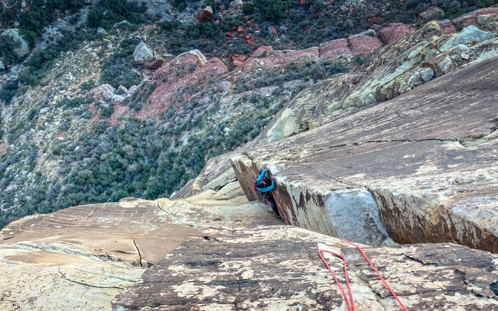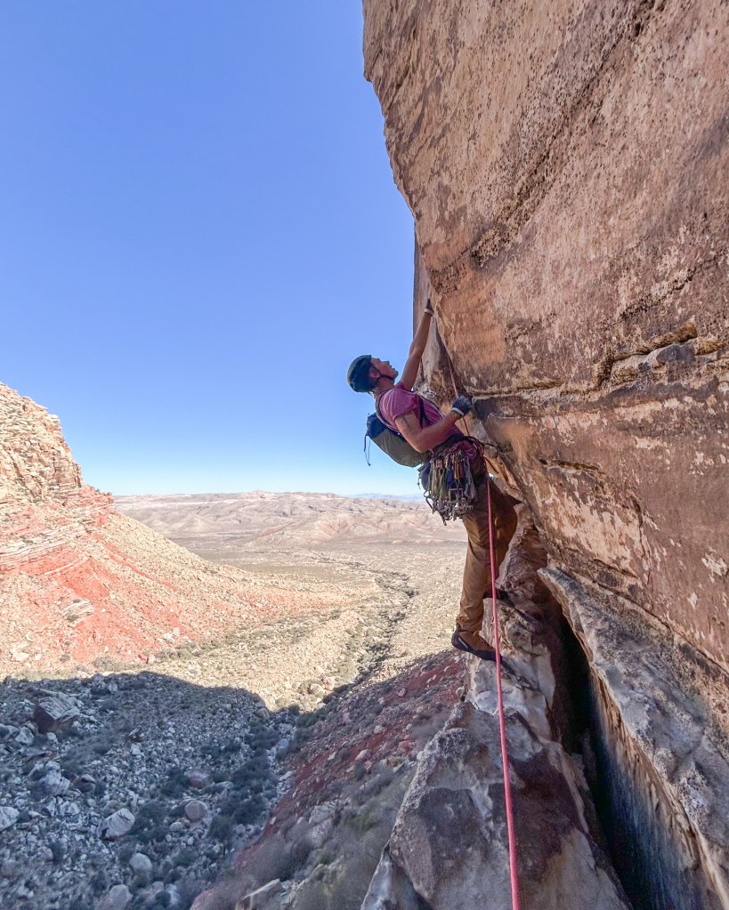 Triassic Sands is a legendary crack climbing route in Red Rocks, home of few long and continuous cracks. The first four pitches follow an incredible crack system the entire way, logging some 600 feet of consistent jamming, with the second pitch’s miraculous 45 meter hand crack being the standout.