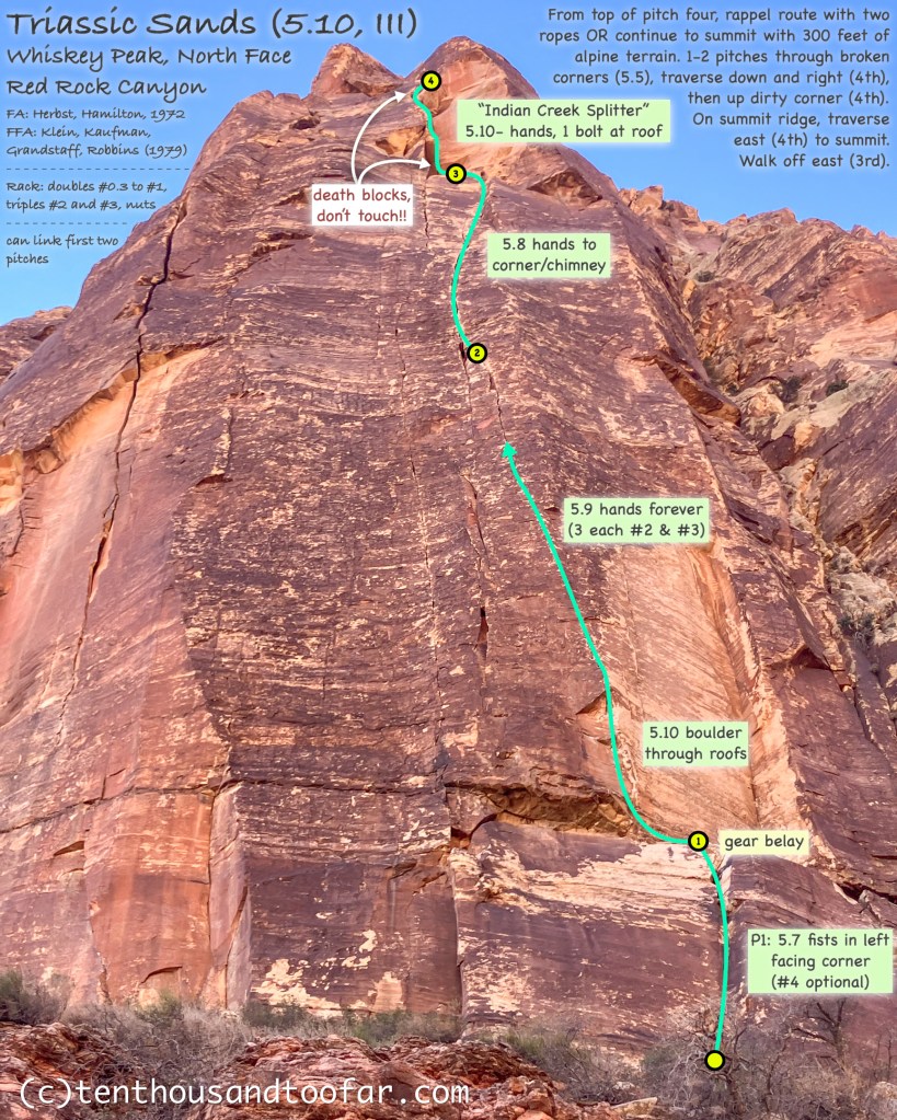 - We completed Triassic Sands in roughly 7 hours car to car, struggling with pitch two but climbing the remaining pitches relatively fast with minimal protection. We stashed packs at the convergence of the Whiskey Peak approach and descent trails, marked by a large cairn.