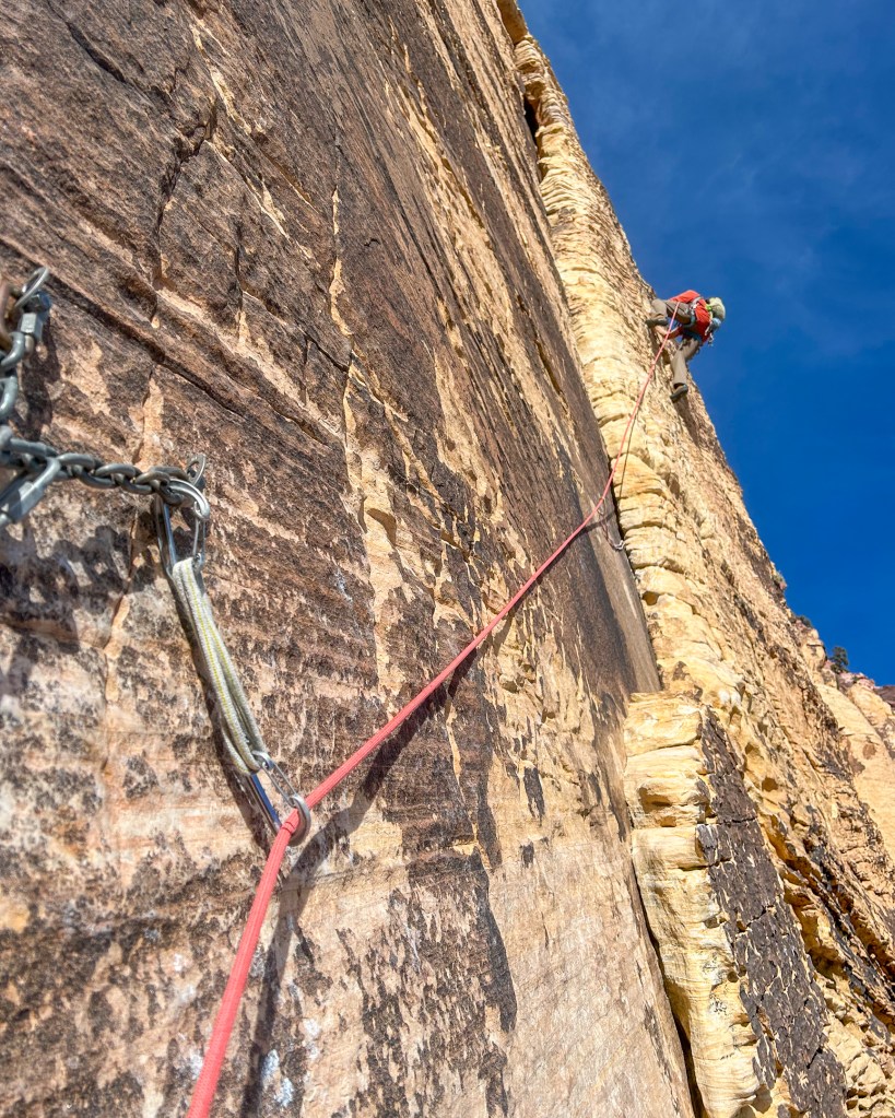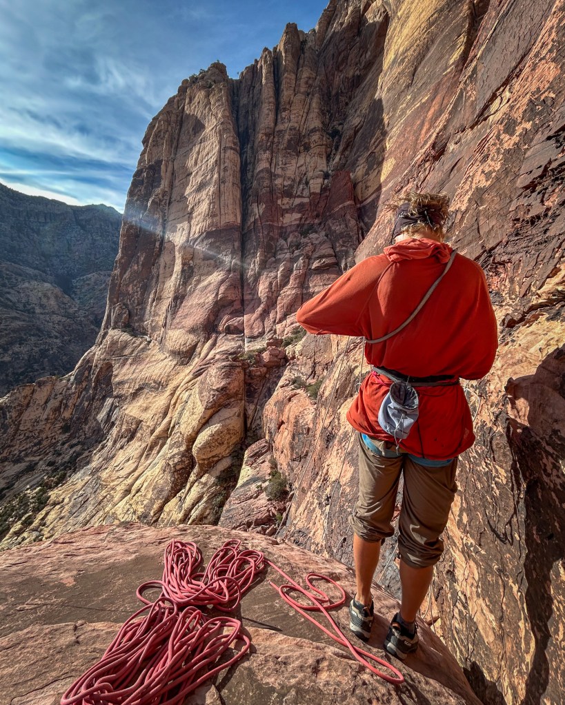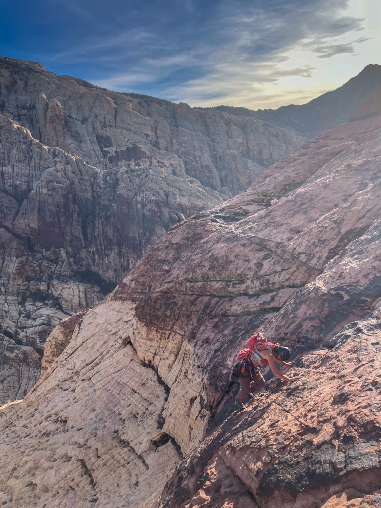 Solar Slab is one of the most popular routes in Red Rocks. From bottom to true summit the business is approximately 2000 vertical feet and 14 pitches, taking a striking line up a captivating south facing slab at the mouth of Oak Creek Canyon. Sure, its only 5.6 and is a popular free-solo for the hardened, but any route 2000 feet tall deserves respect. Most parties rappel the route, but the thought of a dozen rappels over low angle varnished sandstone clogged with other parties made me nauseous. Furthermore, Solar Slab rappel descents skip the final two pitches, exciting summit scramble, and scenic walk off through one of the prettiest areas in Red Rocks, the Painted Bowl. Fixed belays are virtually non-existent in the Tetons, so until 2025 we’d never rappelled a long trad route. We would pack light, carry all our gear over the top, and walk off in style. With the short daylight hours of late December we got the earliest timed entry slot for the scenic loop, arrived at the gate with bags packed at 7:55AM, and cast off from the Oak Creek Trailhead at 8:30AM.