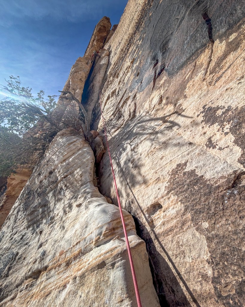 With at least two parties hugging our coattails I voiced intention to climb as fast as possible, placing the bare minimum gear required to keep things civilized. Aside from fixed natural protection and one accidental 5.8 variation which needed more gear on pitch three, I placed 9 pieces of protection in 1500 feet, free-soloing about half the pitches while jamming out to punk music in the soft December sunlight. Rather than simul-climbing, which I generally despise on low angle terrain and especially high angle sandstone, we made use of a short 45 meter skinny rope, nice ledges bolted belays and hasty changeovers to save time. Bobbi followed like a ninja squirrel. Our only serious time penalty was getting off route on pitch two, where I nonchalantly climbed directly up from pitch one into the second pitch 5.9 finger crack of Heliotrope. Had I thoroughly consulted the topo even once I would’ve known to move left. Instead, I had to rappel off a fixed anchor back to Solar Slab, and down solo 20 feet of exposed jugs when the rope fell short. Furthermore, my light rack lacking in small sized cams and wires meant I only scored three pieces in 100 feet of baking hot 5.9 fingers. What doesn’t kill you makes you stronger… they say.