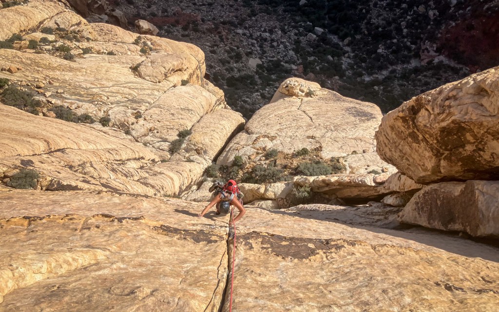 Solar Slab was the perfect bookend to our long season of desert climbing. The Solar Slab Gully was awesome and expedient alpine style scrambling, and every pitch of Solar Slab offered excellent rock quality, regal exposure and a fun diversity of movement. No lead bolts highlights the natural appeal of the line. We carried a single set of cams from #0.3 to #2 Camalot, doubles in #1 and #2, and a half dozen wires. If I were to climb Solar Slab with a partner again I would drop the extra #1 and #2 at least. Long runners were useful for clipping anchors when linking pitches. While simul-climbing is a popular strategy with competent parties, the first three and last two pitches both wander and are low angle enough to create rope drag even if the leader is soloing. In my opinion, this route lends perfectly to short and efficient pitches, with a possible simul block combining pitches three thru seven. Typical for Red Rocks, the 5.6 grade is generous and short lived, with the bulk of the work clocking 5.4 or under. In Joshua Tree, Solar Slab would be rated 5.4. The walk-off is often shunned as long and circuitous, but we thought it was neither. A party of two topped out and began rappelling just behind us, and were still a few hundred feet off the ground when we scurried by a few hours later. Rappelling low angle sandstone is a time consuming risk of both rope and sanity, and if you bail from pitch seven you miss the last two pitches, true summit, and the uncompromising beauty of the Painted Bowl. In the Tetons, the Solar Slab walk-off would be light duty at best.