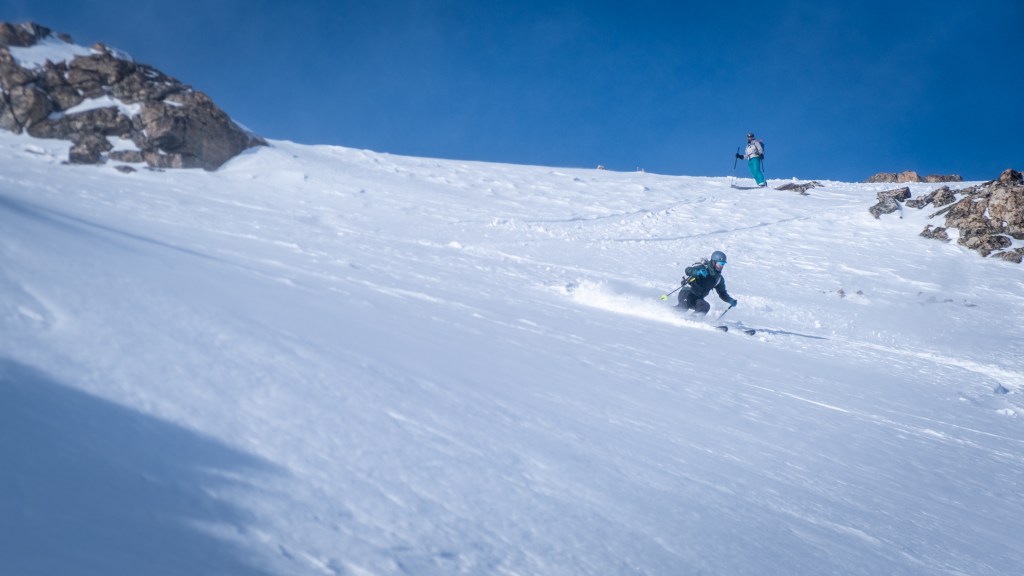 The “Banana Couloir” is really not a couloir, but rather, a 3,300 foot slide path of epic proportions. The entire descent is pure “fall line”, sustaining an average slope angle just above 30 degrees with no pitches steeper than 38 degrees, making for a incredible moderate objective catered to fast and fluid skiing.