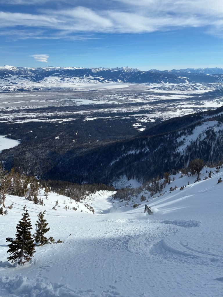 After much deliberation over the respective approach distances from two different trailheads – Death Canyon and Granite Canyon, we chose Granite. This appears to be the standard strategy, and is 30 minutes closer from our homes in Idaho. Reaching the top of the Banana involves some 5,000 feet of elevation gain and a lengthy circuitous approach through a heavily featured low forest known as “the maze”. I’m not a GPX track guy, but every time I get lost in the maze, I condemn myself for not adopting 21st century digital mapping tactics. We reached the base of the line in one bushy hour and began our slog to the sky. A skin track was in place from the day before, but sticky skinning conditions forced us to cut our own track up shaded trees on either side of the Banana. We switched to boots at the final headwall and made the ~11,000 foot summit in five moderate paced hours.