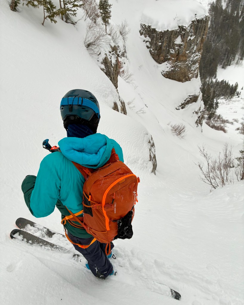 Directly east of Alta Dena Bowl is Alta Dena North, defined on the map by two gradually tightening and converging couloirs forming a “V”. We began skiing in epic open powder directly above the skier’s left couloir, but quickly cut south to access the right couloir. In quintessential Teton Canyon style, this couloir was lightly vegetated with a mysterious rollover at the lip, ultimately concealing a 40 foot cliff. With CalTopo in hand we traversed right above this cliff, skied a few turns through dense trees, then cut left above another steep cliff back into the right couloir. Here we were greeted to 150 feet of steeper turns above yet another, larger, cliff. This was the spookiest moment of the descent, as the walls on either side were prominent enough to feel genuinely trapped. CalTopo urged us to traverse into the left couloir, but a protruding limestone rib barred clean passage. About 30 feet above the edge we were able to shuffle over a very exposed and narrow break in the rock and traverse into the left couloir. A miraculous 10 foot break offering memorable jump turns us saw us to the apron. Had we a rope Alta Dena North would’ve been memorable, but without it was exhilarating. Until the final traverse into the left couloir, 30 feet above the apron and 850 feet below the ridge, we had no certainty the line would ski cleanly. Poking around blind corners and shuffling over cliffs, GPS in hand, and ultimately succeeding accompanied by excellent snow was a truly unique experience.