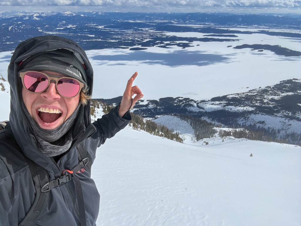 The drive from Teton Valley to Colter Bay is sneaky long, nearly two hours given winter road conditions. I once again got detoured by a low motivation Americano stop at Cowboy Coffee. Quite frankly, I’m embarrassed by my lack of ski drive this season. I had exactly zero inspiration from the second I opened my eyes at 5:00AM, dragging myself to Jackson Lake under penalty of insanity. I launched at 8:00AM sharp with every intention to skate across the lake, but wind drifted snow quickly forced me to skins. Within the hour I dispatched the three mile lake crossing and started up the southeast ridge. Much like seemingly every damn day this winter, the sun broke with unforecasted tenacity. By mid-morning I was trail breaking through two feet of wet snow, with hundred pound skis. Where were the mid-twenty degree temps, light clouds and high winds that were supposed to keep snow surfaces cool? I guess they took another day off. On February 16th, Peak 10,686 felt like Cabo. Including stops to dig three hasty hand pits on various aspects, I dragged my sorry ass to the summit just under four hours.