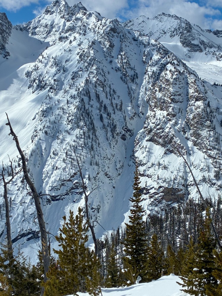 Given how severely and unexpectedly solar aspects warmed, the 35 degree east face of 10,716 was off the table – bummer, because it looked cooler than expected. The combination of warming, visible wind loading and a spatially variable persistent slab problem was just too tall an order for solo skiing, especially after the avalanche scare. Instead, I tucked tail and headed for the Southeast Face, a 3,500 foot avalanche path reminiscent of the Banana Couloir. The gut and skier’s left wall was undesirably crusty, but the slightly northeast tilted skier’s right wall harbored just dry enough snow for a pretty damn good rip. Around 9,000 feet I transitioned to the ascent ridge, avoiding exposure to sheltered slopes consistent with the persistent slab issue. I was able to weave a neat line down the gladed ridge with mostly soft turns, and several open shots, to the lake.