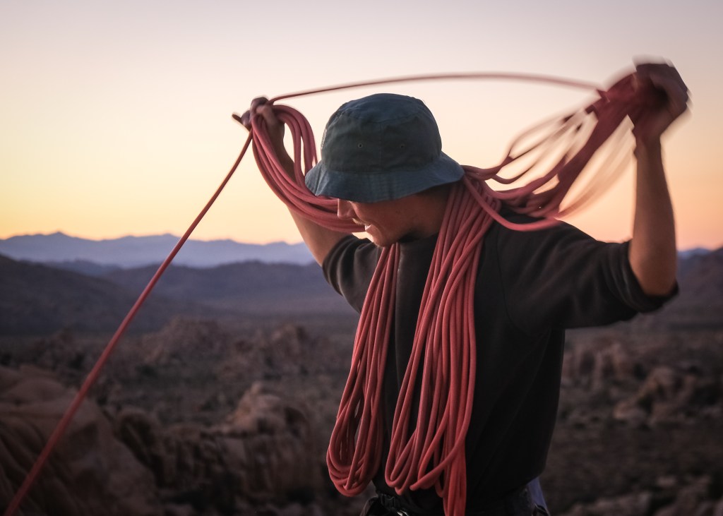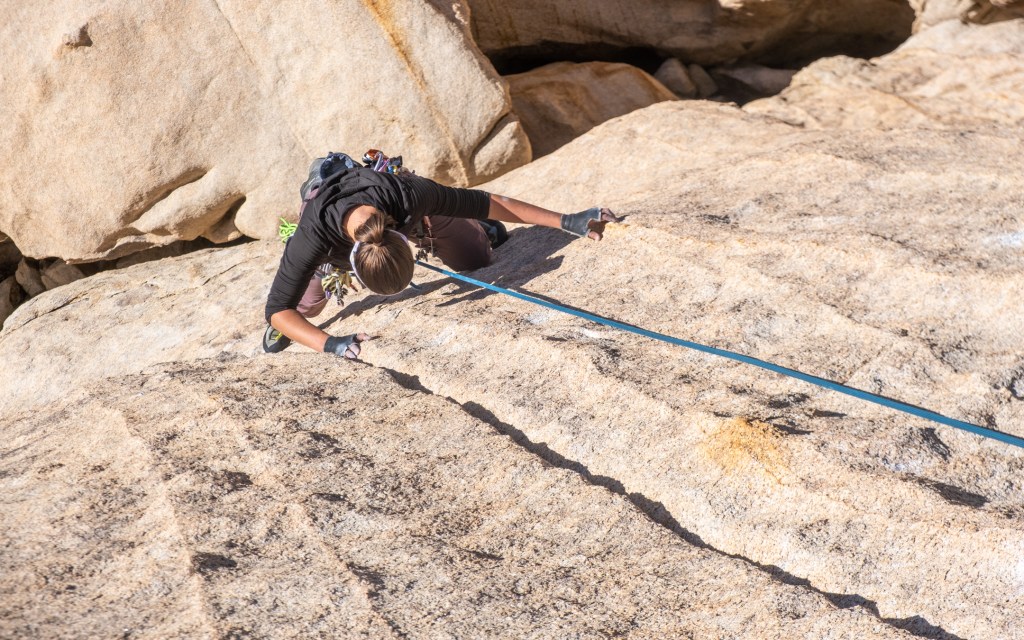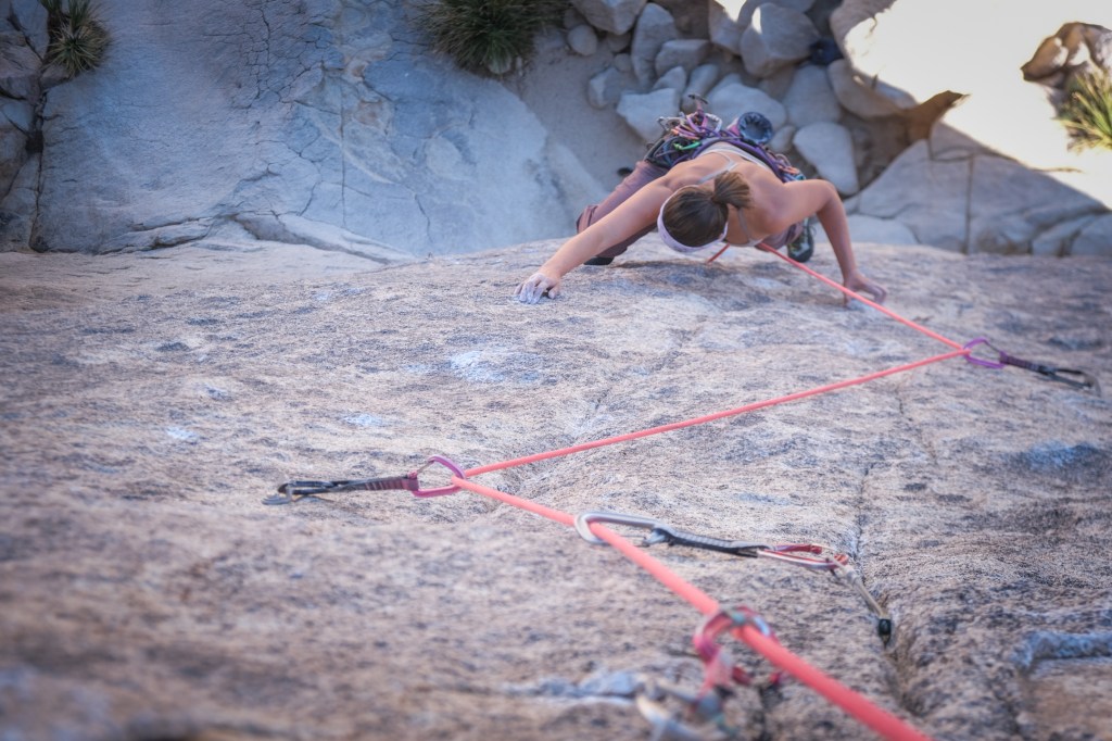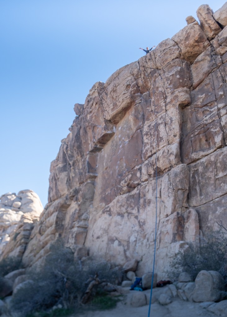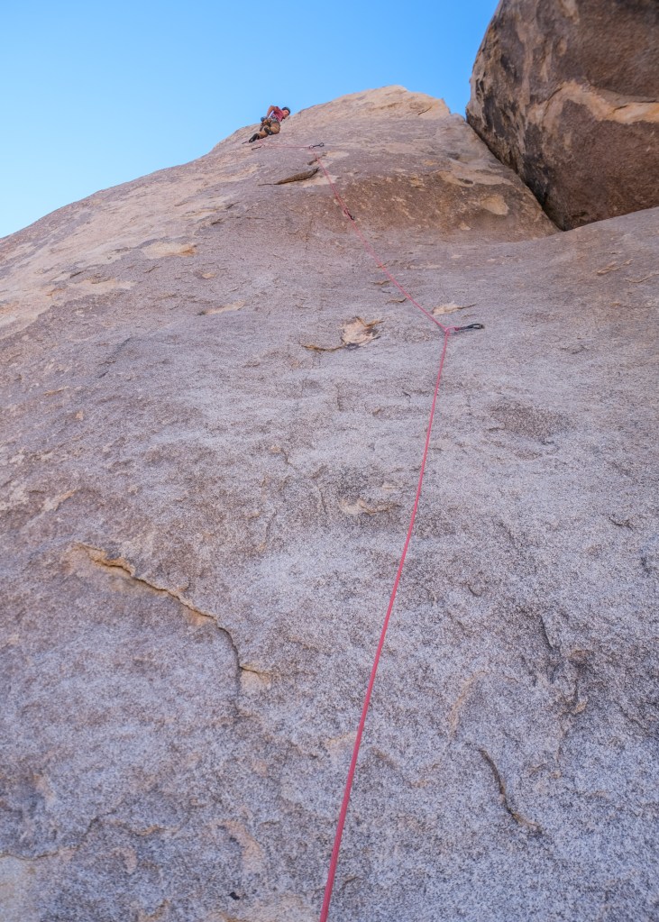 By any quantifiable metric Falcon is not a classic. But among the rare breed of ground-up slab enthusiasts it’s known as a good route, and the hardest with a guidebook star on Echo Rock. Falcon is sandwiched between the all-time classic Heart and Sole (5.10a) and revered Quick Draw McGraw (5.10a), with four bolts zig-zagging up the center of a massive heart shaped flake. I first noticed the route when rappelling off Heart and Sole, but didn’t touch any holds to preserve an honest onsight. As someone who is drawn to atypical routes, the twisting bolt line immediately caught my eye, connecting subtle dishes, ripples and crystals up an otherwise remarkably smooth face. But at “Joshua Tree 5.10c” with 15-20 foot runouts, the moment needed to be right. 11 months later, at sunset, I tied in and started off. The crux comes shortly after clipping a high first bolt – a brutal single toe mantle on a minuscule black crystal with brail code handholds. The remainder clocks closer to 5.10a, but sustains difficulty longer than its neighbors. I spoiled my onsight falling nonchalantly at the second bolt, blew the crux mantle on second go, and successfully redpointed on take three. The year before, Bobbi and I watched an unknown climber overcome the final runout at sunset, high stepping valiantly on 5.9 edges 20 feet above the last bolt and glowing heroically in the fading winter crimson light. One year later, that person was me. Watching Bobbi top-rope flash while Joshua Tree descended into November night was equal parts beautiful, tranquil, and prideful.