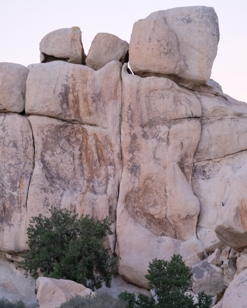 After Illusion Dweller our energy gradually waned. Dappled Mare (5.8, 4 pitches, 400’) on the Lost Horse Wall, and Bat Crack (5.6, 2 pitches, 200’) on Intersection Rock were pleasant, light hearted, adventure outings. Tax Man (5.10a) was a sinister and stellar punctuation to our streak of hard crack climbing. Damper (5.9), Captain Kronos (5.9) and Jack of Hearts (5.9+) were yet another three sleeper 5.9 cracks worth seeking out. Repeating classics like Double Cross (5.7+), Hands Off (5.8), Looney Tunes (5.9) and Pinched Rib (5.10a) kept nostalgia high and hearts full. And of course, no stay in Joshua Tree would be complete without uncovering a long forgotten ground-up slab. Good To The Last Drop (5.9 R) on The Wall filled this niche. The guidebook calls the final runout “heinous”, but I only read the description after I survived the route. If you’re into that sort of thing, spot the ninety foot golden seam hanging above the Hidden Valley Campground, left of the massive Damn Jam chimney. Scramble to the base, tie the belayer to the first bolt, and hop across a chasm to the wall. Two bolts protect playful climbing on hollow flakes, leading to a vertical crack which takes gear until flaring out 30 feet below the last bolt on a bumpy vertical slab. The climbing defending the last bolt is a psychedelic experience, an exercise in footwork, balance and mental fortitude – all things Joshua Tree. Risk aside, both Bobbi and I thought Good To The Last may have been the best friction slab we climbed all year, and I look forward to repeating it for years to come.