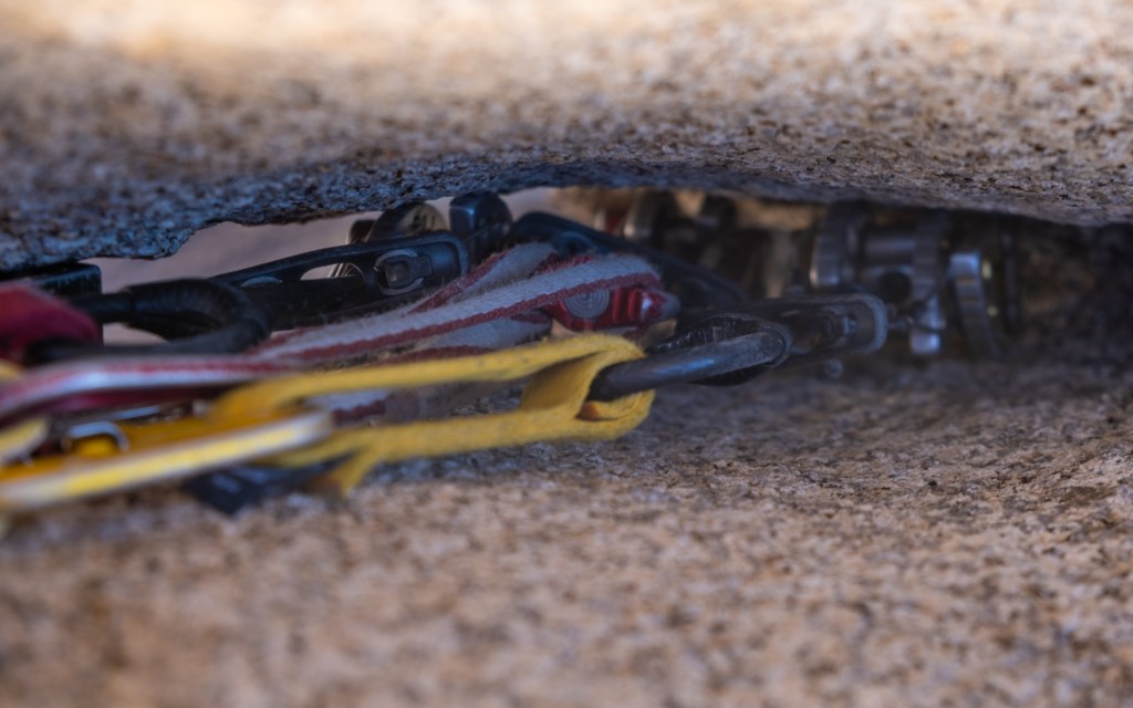 There are two distinct cruxes on Illusion Dweller, bouldery tips laybacking right off the ground, and a flaring hand crack out a square cut roof just before the chains. The remaining 30 meters is a crash course in slippery Joshua Tree jamming of all sizes. I carried a double rack of cams from #0.2 to #2 and used quite literally every single one of them, augmented with a single #3 and half dozen wires. Several times the wheels teetered from my wagon, but I managed to hold on with puffs, grunts, and very little style. A no hands rest before the final roof allowed pump to drain, but suspense to build. As my feet skittered from tricky smears in a now fiery late morning sun, I thrutched to a sloping jug, cut feet, and scummed knees to salvation. Was it glamorous? Not in the slightest. Was it pleasant? I’m not really sure. But ultimately I was extremely satisfied with my effort, and grateful to belong on such a historic climb. The Peanut crushed beyond expectation, achieving a valiant two hang ascent. Turns out that damned roof is a notorious send killer.