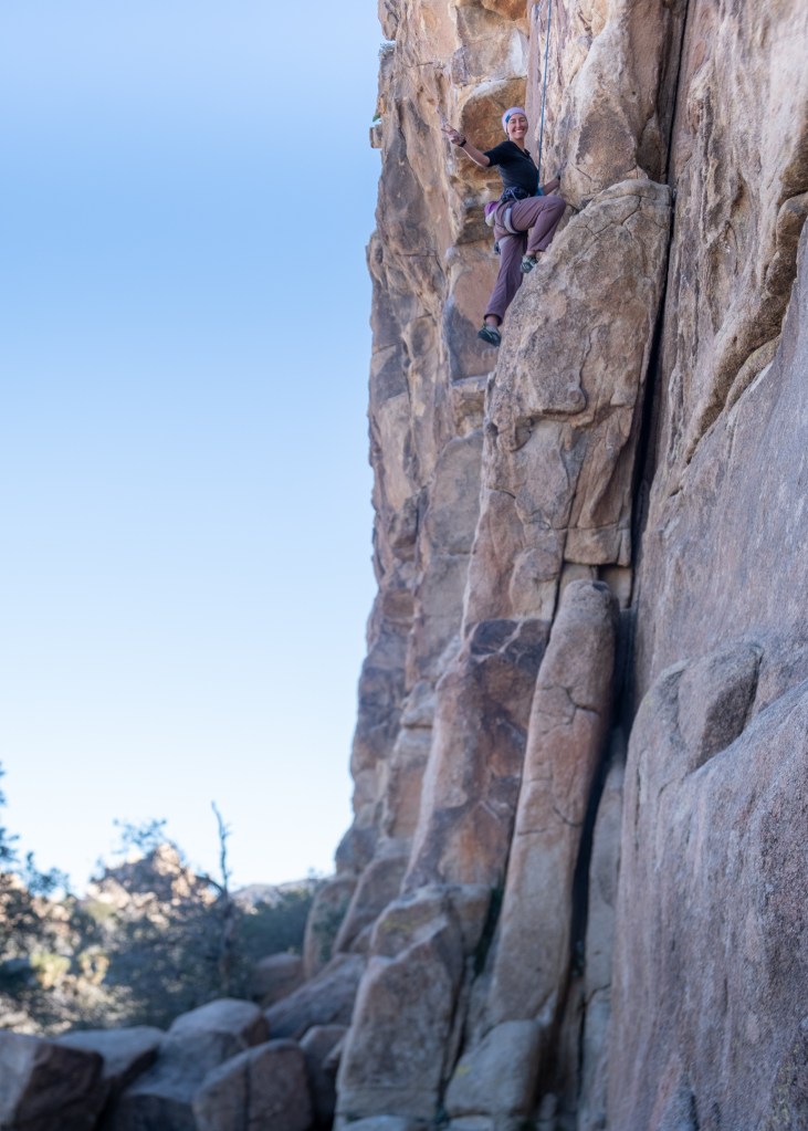 Joshua Tree holds a special place in Bobbi and I’s heart – a mythical wonderland of countless granite boulders sculpted by magma, water, wind and time, strewn haphazardly across a vibrant high desert of technicolor cacti, pastel flowers, threatening yucca and the enigmatic Joshua Tree. We took our first climbing-centric vacation here in January 2024, crimping, jamming and smearing ourselves into a delirium of split tips and achy tendons. We returned in January 2025, and after surviving another revelatory two weeks voiced mutual dreams to own a second home in “Josh” someday. While known for nails hard and unapologetically bold single pitch traditional climbing, Joshua Tree really has it all: bouldering, steep modern sport climbing, multi-pitch climbing up to 400 feet, thousands of cracks in every size, beginner jug hauls and mind bending slabs. Rest day activities include picturesque hiking to craggy mountains and abandoned mines, excellent trail running, star gazing, scrambling, and superb camping. The town of Joshua Tree is energetic, bulging with coffee shops, bakeries, diners, a ridiculously well stocked climbing store, art exhibits, book shops, farmer’s markets and any other hipster amenity imaginable. Were it not for brutally hot summers and an unreasonably long distance from snowy mountains, I could imagine living in Josh forever.