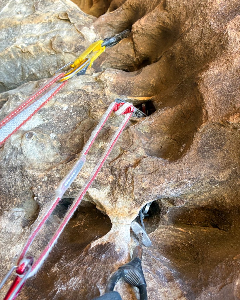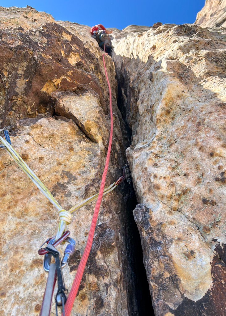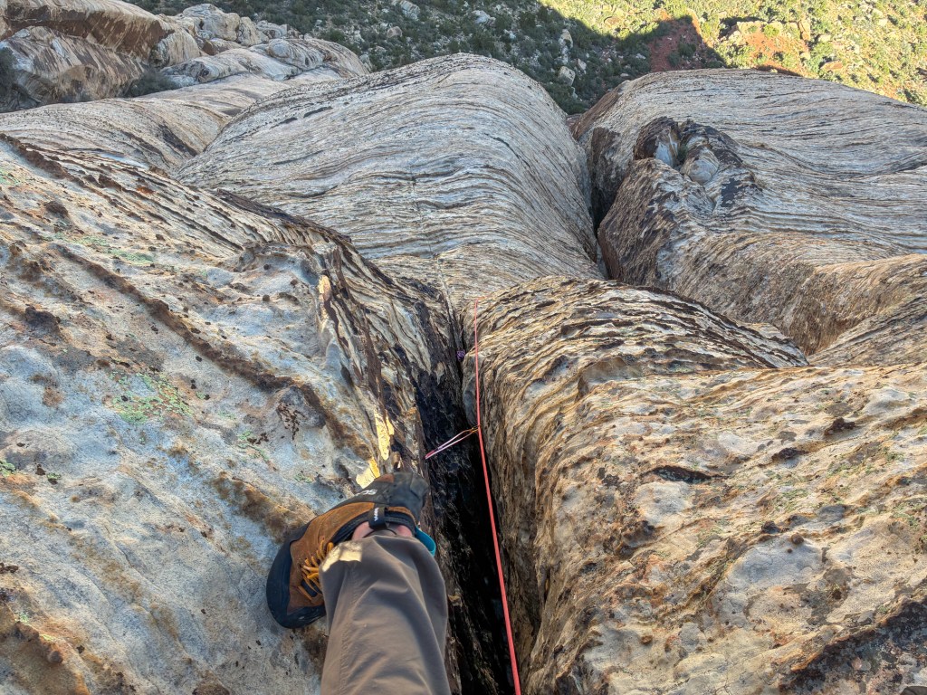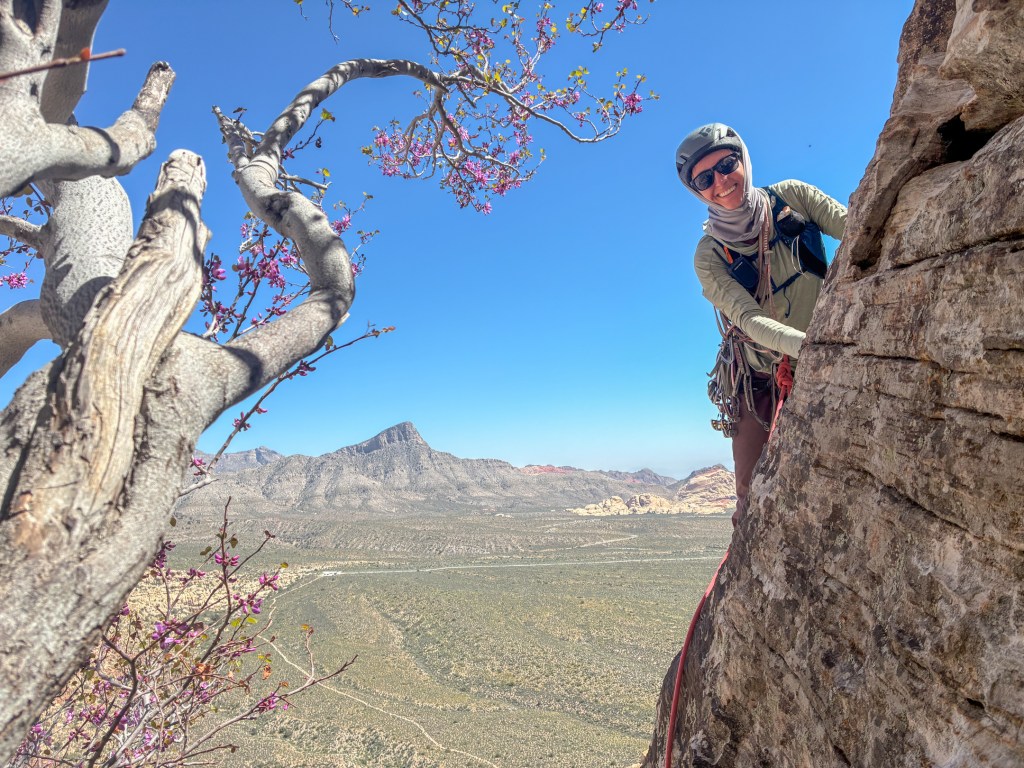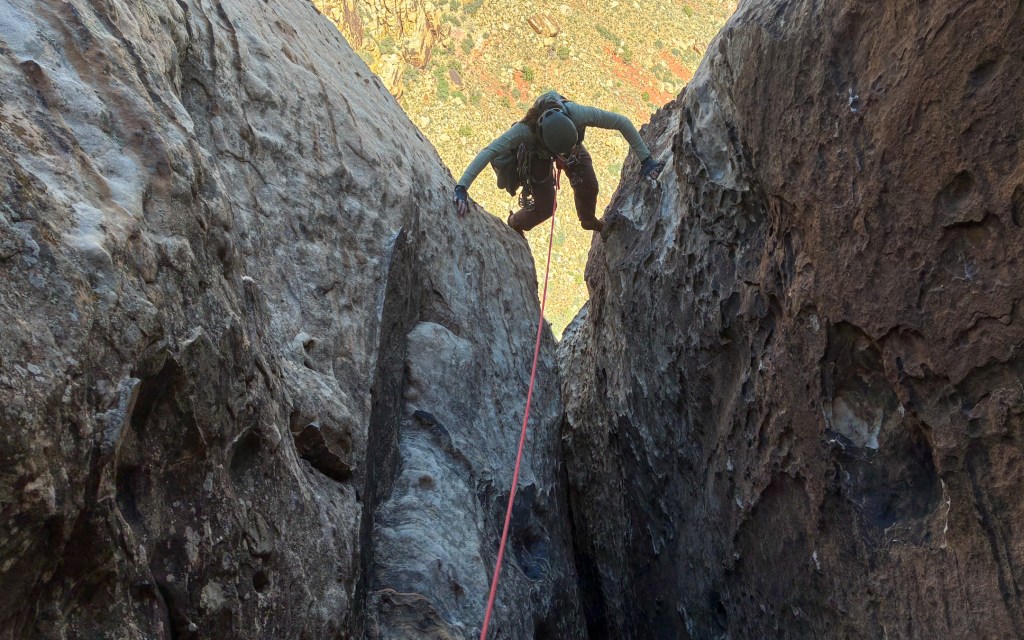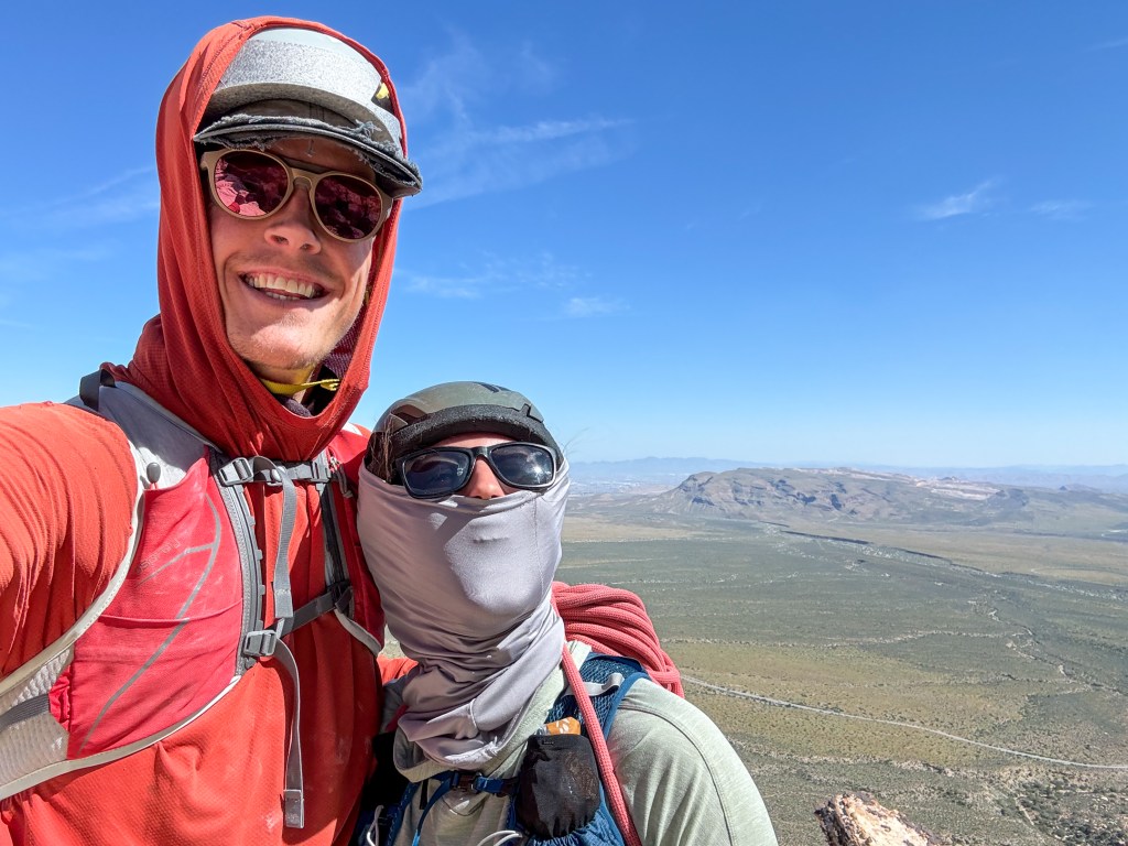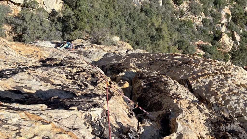 Winter is over! Good riddance. 2026 was a tough one, and while I feared missing my first April ski season in 11 years would leave me directionless, I actually feel liberated. Bobbi and I departed Teton Valley for the Mojave Desert the last week of March, to begin an environmental consulting project in Southern California on April first. After a stopover to see friends and family in Salt Lake, we had five days to both climb and finish work errands in Las Vegas. We opened the outdoor climbing season as we often do, by racing up a long moderate with a short rope, light rack, all smiles, and low stress. For the most part, that’s how Group Therapy played out.