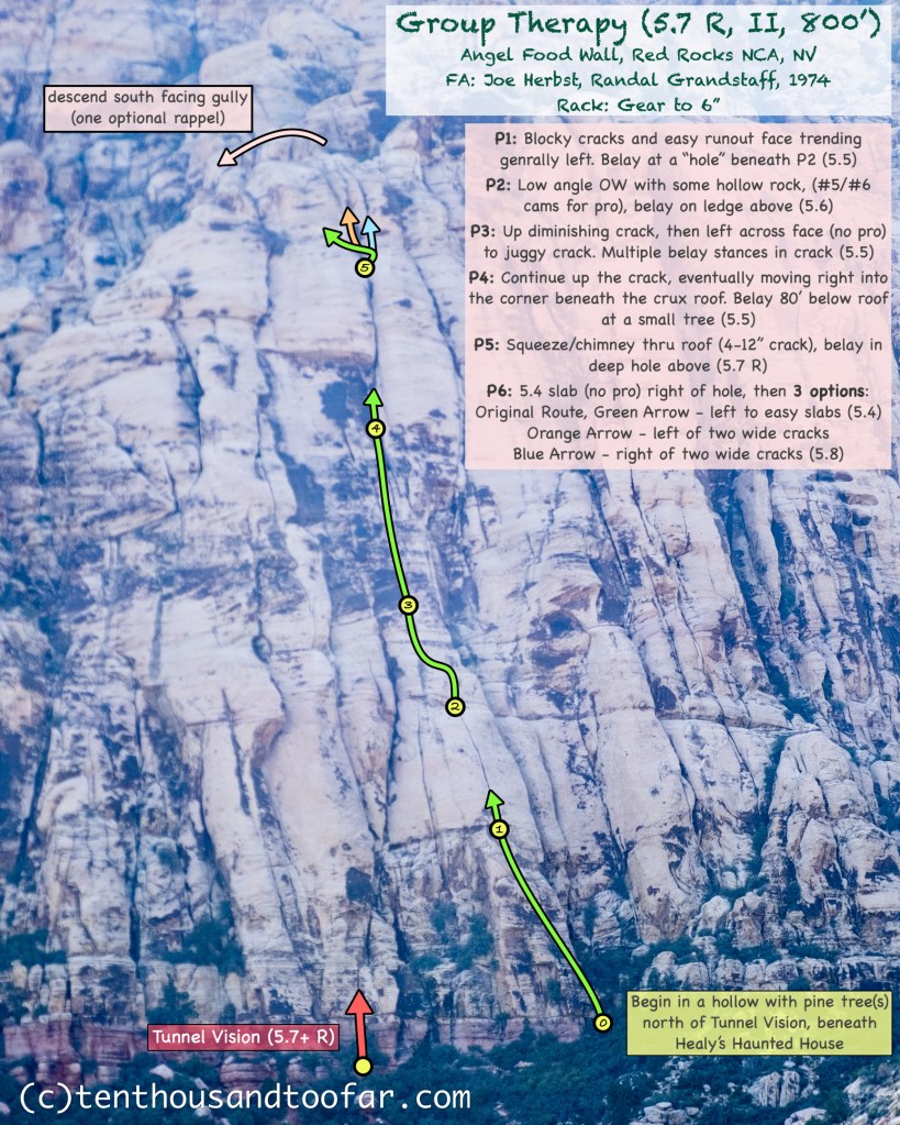 Group Therapy tackles the most obvious weakness on the proud Angel Food Wall, featuring a nice diversity of face and crack climbing at a moderate grade. The route’s keynote feature is a wildly intimidating square cut roof which somehow, someway, goes fairly at the 5.7 grade. The first four pitches were classic Red Rocks plate hauling, with one particularly neat 5.6 off-width and a few juggy cracks linked by easy but runout face climbing. The crux roof was exceptionally unique, with an off-width start quickly widening to a comfortable chimney. You never really “pull” the roof, but rather squirm through it. This pitch is high quality but seriously lacking in protection, probably why Group Therapy flies under the Red Rocks 5.7 radar. For the sixth and final pitch you have three choices. The original route exits the crack system via easy traversing slabs south, while two parallel cracks provide harder direct options. We climbed the right most of these cracks, with a few 5.8 moves waning to yet another easy wide crack.