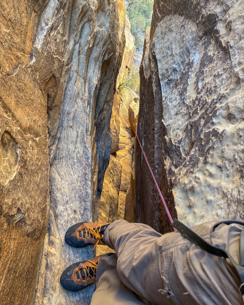 Though we brought two ropes to hasten our descent, we rappelled the entire route with a single 70M to minimize any chances of ropes getting stuck. Bobbi followed the entire route clean in expedient fashion, but was generous enough to let me redpoint pitch four on the descent. My only other fall was from getting off route and breaking a hold on pitch three, and because I resumed from a huge no-hands ledge I could’ve enjoyed a picnic on, far below the crux, I felt comfortable checking Norepinephrine off the list.