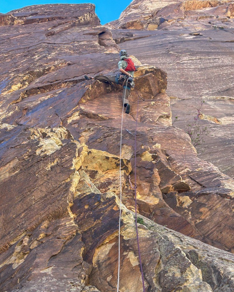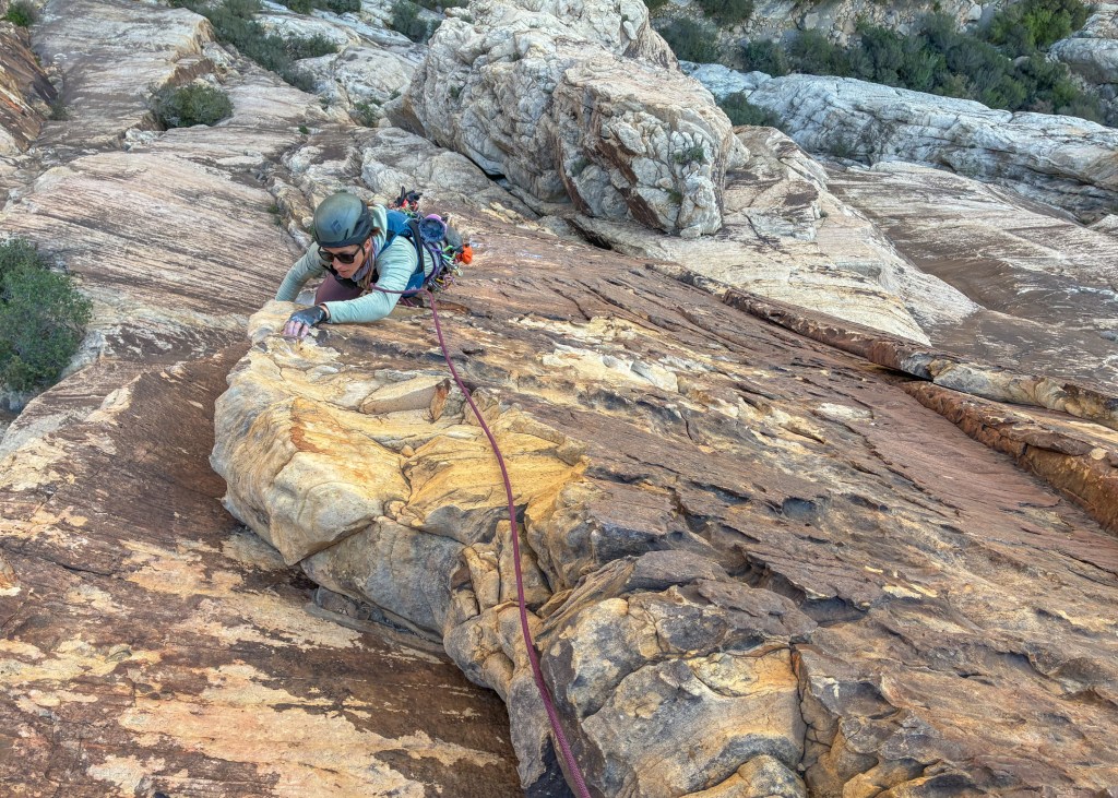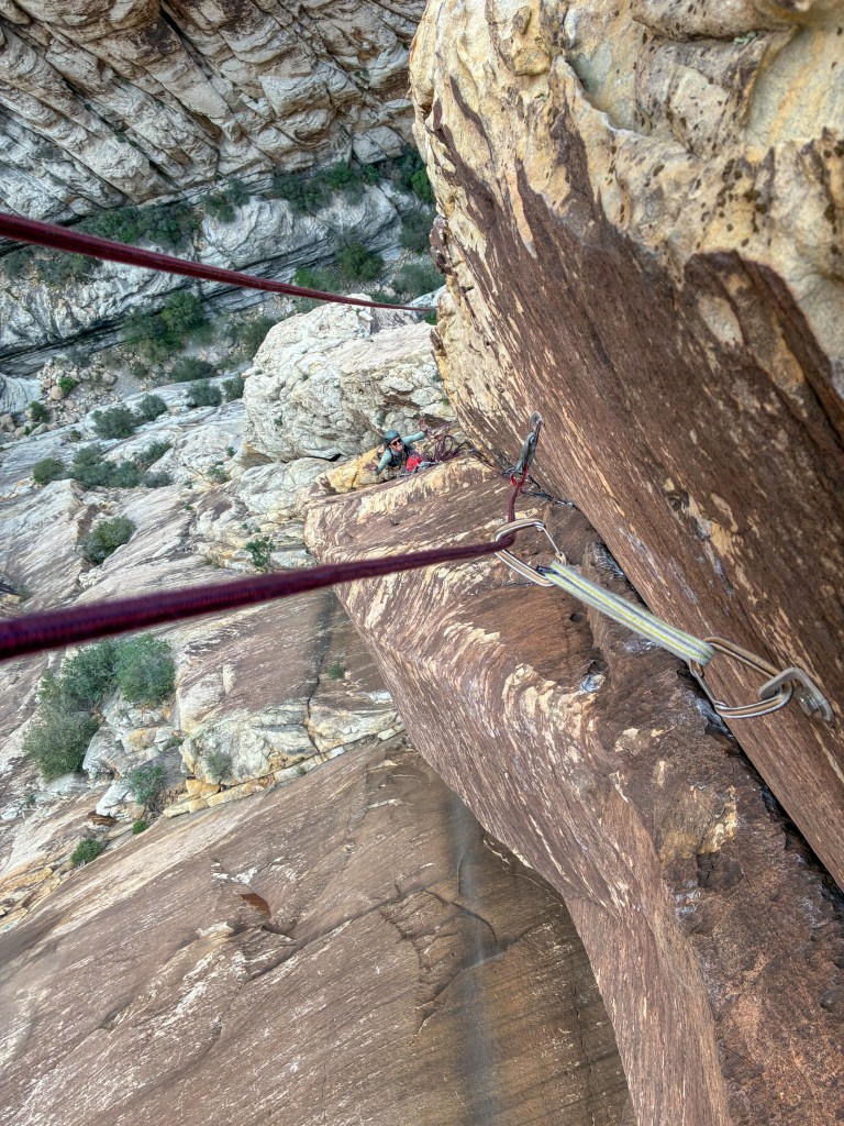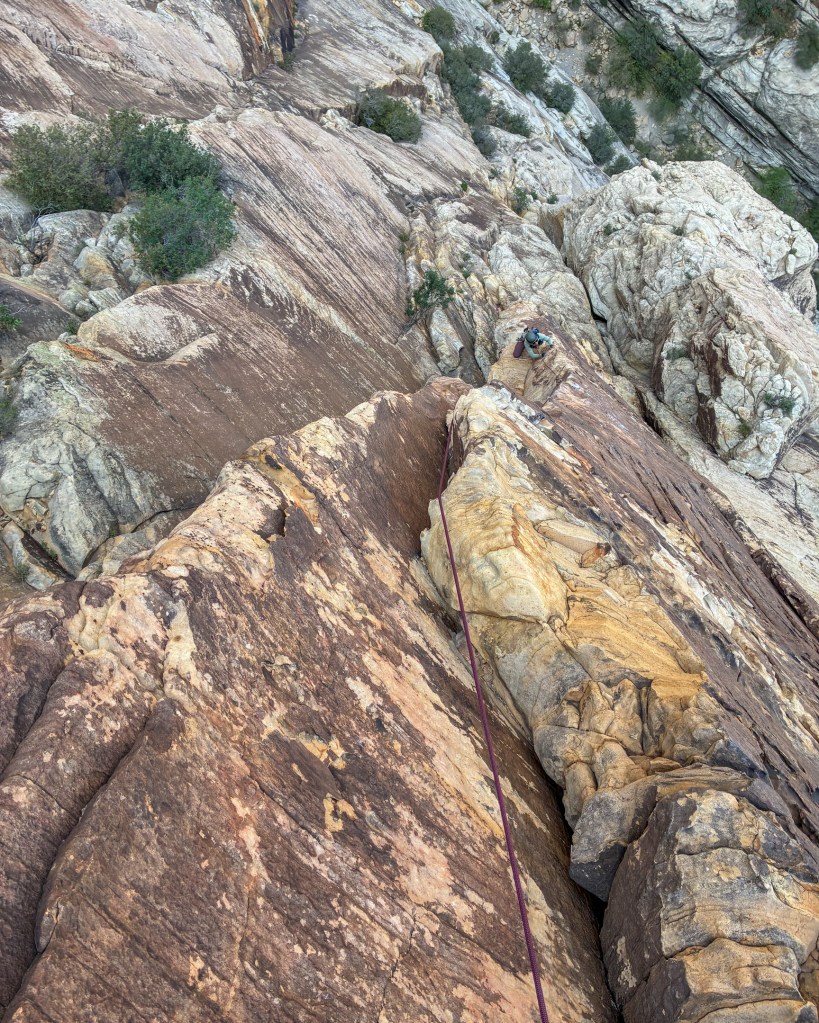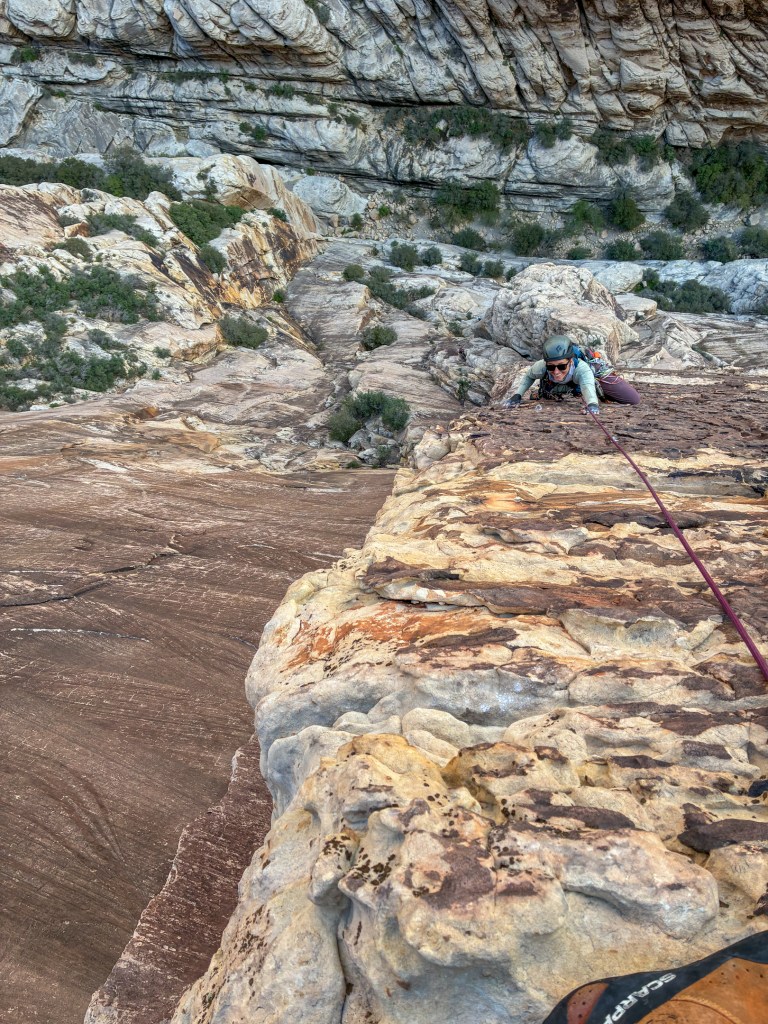 The first arete pitch – pitch three – is the crux, with six well spaced bolts leading through a small roof to a hidden hand crack behind a massive flake. After pulling the roof and clipping a few bolts on the arete, I struggled to find the next and presumed it out of sight. Intuitively, I ventured onto the generously featured face left of the arete, but quickly met runout climbing on exfoliating rock. Several tense sequences of three-points-on climbing led to a horizontal break where I got my first good protection in twenty feet, a deep #4 Red Metolius. At this point, still unable to see any bolts and surrounded by flaky rock, I knew I was off route. Right on cue, while I made an emergency dash for the arete, a foothold the size of a pie plate snapped. Before I could comprehend my demise I was slumped on the rope, grateful for the Red Metolius that kept me from falling all the way to the Vegas Strip. Pendulum investigation revealed a line of sand colored bolts in tan rock on the right side of the arete. I clipped the nearest bolt, back cleaned the face, and onsighted the remainder of the pitch from a no-hands ledge above the roof. While this pitch – as well as a few to come – felt slightly contrived due to an abundance of larger holds on the face, it really was a memorable piece of climbing. The crux was an exposed rounded layback with ridiculous positioning on the knife’s edge, and the splitter hand crack behind a massive overhanging flake after bolt six was one of the more unique features we’d ever climbed. For how hard I worked to get this 120 feet done, I was impressed to watch Bobbi scamper up with little resistance.
