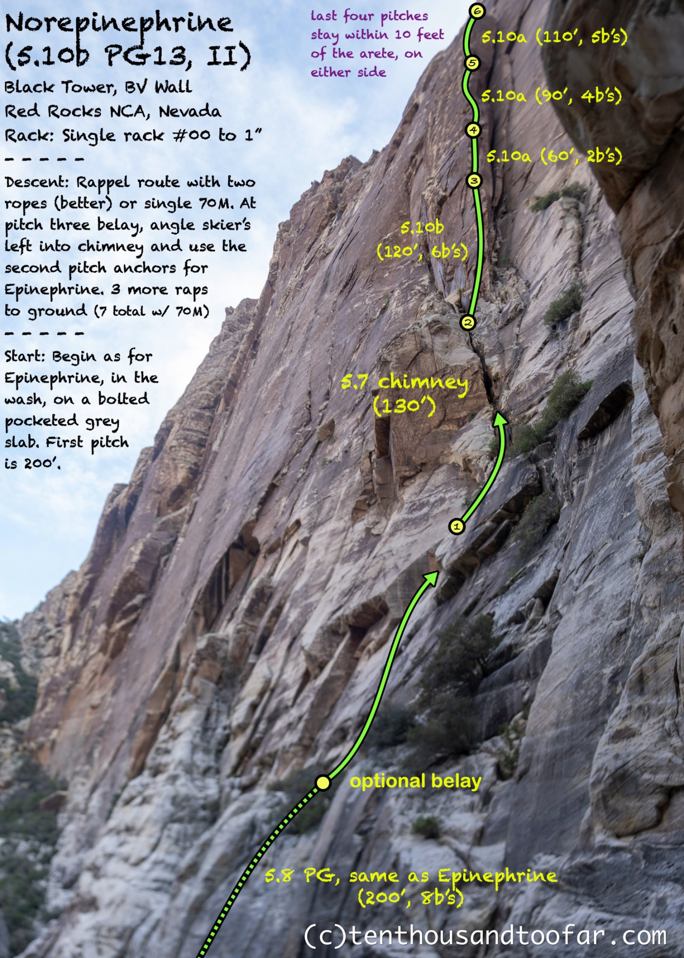 Bobbi and I found ourselves on an every other day climbing schedule this short six day Red Rocks stint. We intended to climb more, but last minute work errands before our March 31st start demanded attention. For our final outing we wanted to up the ante with a longer 5.10 on the Black Velvet Wall. Our first choice was Dream of Wild Turkeys, but much like the day we ended up doing Rock Warrior, Turkeys was overrun by four parties. Yes, four parties. Having already climbed Refried Brains, Rock Warrior and Sour Mash, which represent the bulk of Black Velvet’s sub-5.11 terrain, we were stumped. It was too late to quest up Epinephrine, and Fiddler On The Roof has a serious 5.10+ traverse that seemed a little testy for first 5.10 of the year. Then I remembered one last route hiding on the far margin of the wall, with an underground reputation as a lesser known classic – Norepinephrine. At 5.10b, with four straight pitches of 5.10, it offered the perfect challenge.