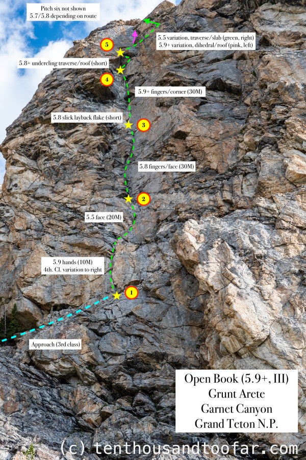 On July 24th, Liam Wylie and I climbed Open Book, a six pitch, 450 foot, grade III rock route on the southeast face of Grunt Arete, the first rock feature east of Disappointment Peak's SE Ridge, beginning in Garnet Canyon. Open Book is a Teton classic by all standards, with a stacked deck of unrelenting 5.8+ to 5.10- climbing above dramatic exposure. We finished the route in about eleven hours car to car, and had a tremendous time doing so.
