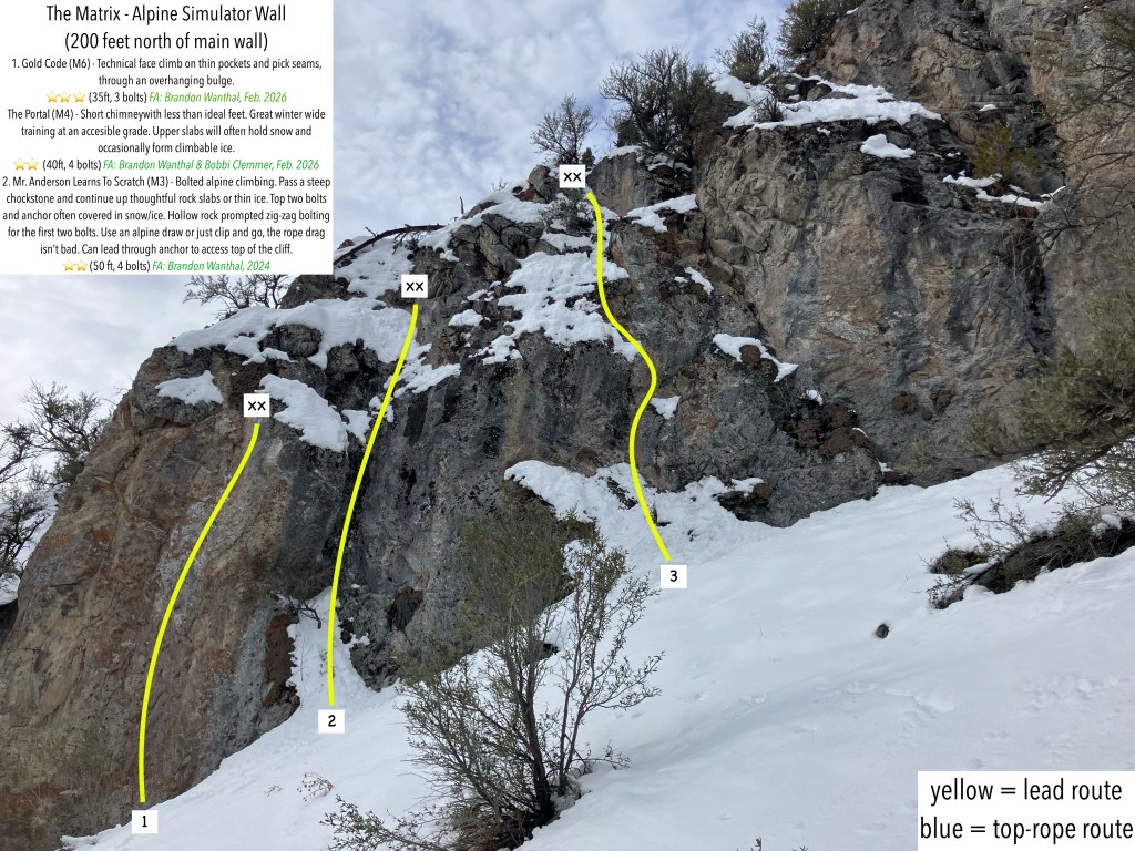 Third Ascent: open - Mr. Anderson Learns To Scratch (M3): A low-angle introduction to alpine-style mixed climbing. A tricky move around a chockstone leads to a clean slab with just enough features to keep things casual. Spongy rock promoted funky placements for the first two bolts. An alpine draw may be desired for the for the first or second bolt, or just clip and go – the rope drag isn’t bad. Because the rock above this route is uncommonly clean, climbers can lead through the anchor to the top of the cliff. The last two bolts and anchor are often covered in snow or ice. Bring some rock protection in mid-winter.