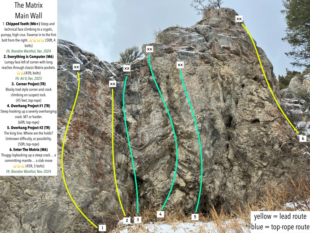The Matrix is a drytooling crag located in the Big Hole Mountains, accessed via Idaho State Highway 31 (Pine Creek Pass). Below is a crag description, route list and topo for Matrix climbers.